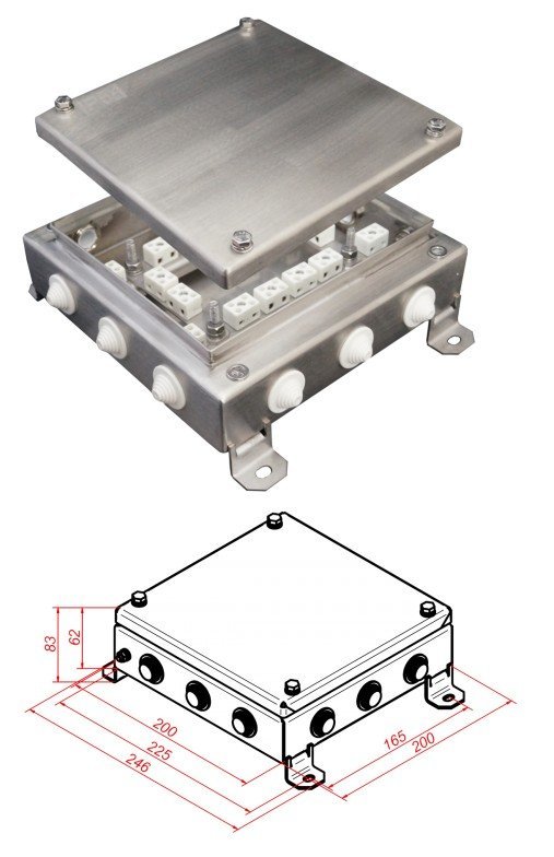 Коробка монтажная огнестойкая. Коробка монтаж.огнестойкая, керам.колодка 32х3мм², 12 вводов, IP55, tраб.-40…+60°С, габ.размеры 200х200х60 мм, нержавеющая сталь