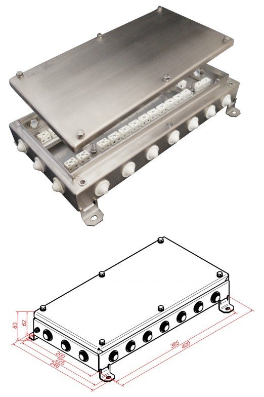 Коробка монтажная огнестойкая. Коробка монтаж.огнестойкая, керам.колодка 64х3мм², 20 вводов, IP55, tраб.-40…+60°С, габ.размеры 200х400х60 мм, нержавеющая сталь