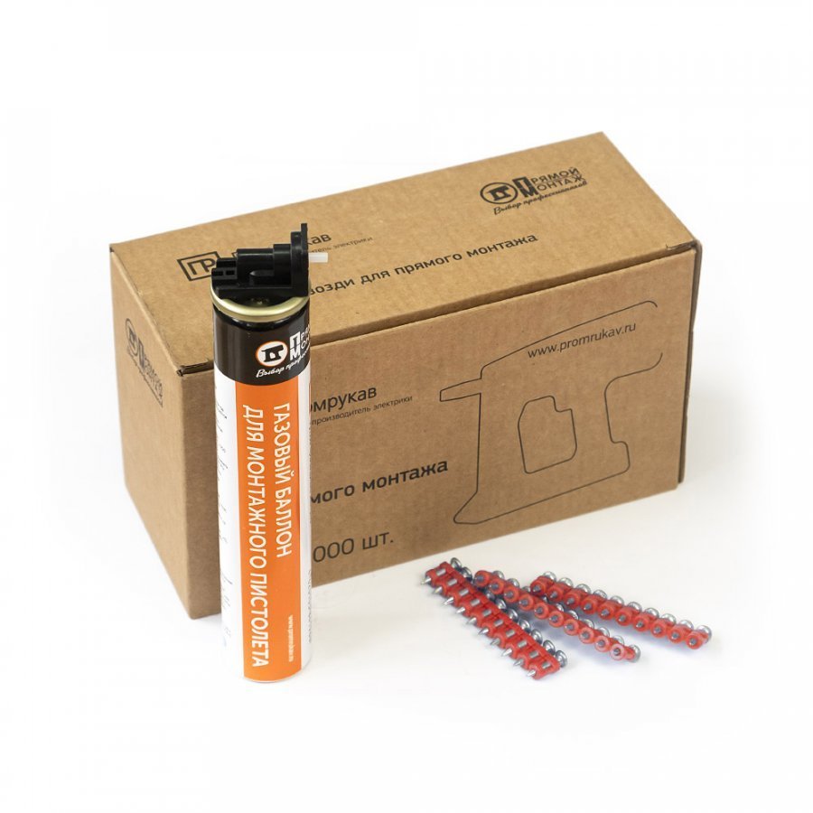 Комплект из газового баллона и гвоздей для прямого монтажа от компании - производителя "Промрукав" предназначен для монтажных пистолетов. Газовый баллон - это основной топливный элемент для газовых гвоздезабивных инструментов. Его длина 165 мм. Он позволяет забить от 1000 до 1400 гвоздей с одного баллона. Баллон предназначен для монтажных пистолетов с энергией выстрела от 80 до 110Дж. Специальная смесь сжиженного газа и лубрикантов позволяет продолжительно использовать инструмент без смазки основных узлов. Гвозди при помощи монтажного пистолета применяются для крепления различных изделий практически к любым несущим поверхностям. Благодаря особенностям конструктива и материала изготовления гвоздей, возможен монтаж изделий не только к бетонным поверхностям различной прочности, но и к кирпичным стенам или металлическим поверхностям толщиной до 5 мм включительно.