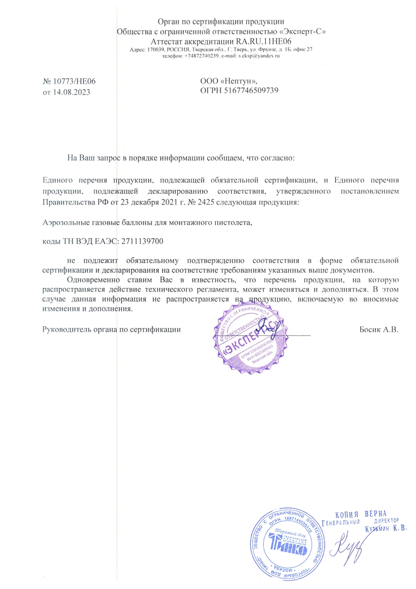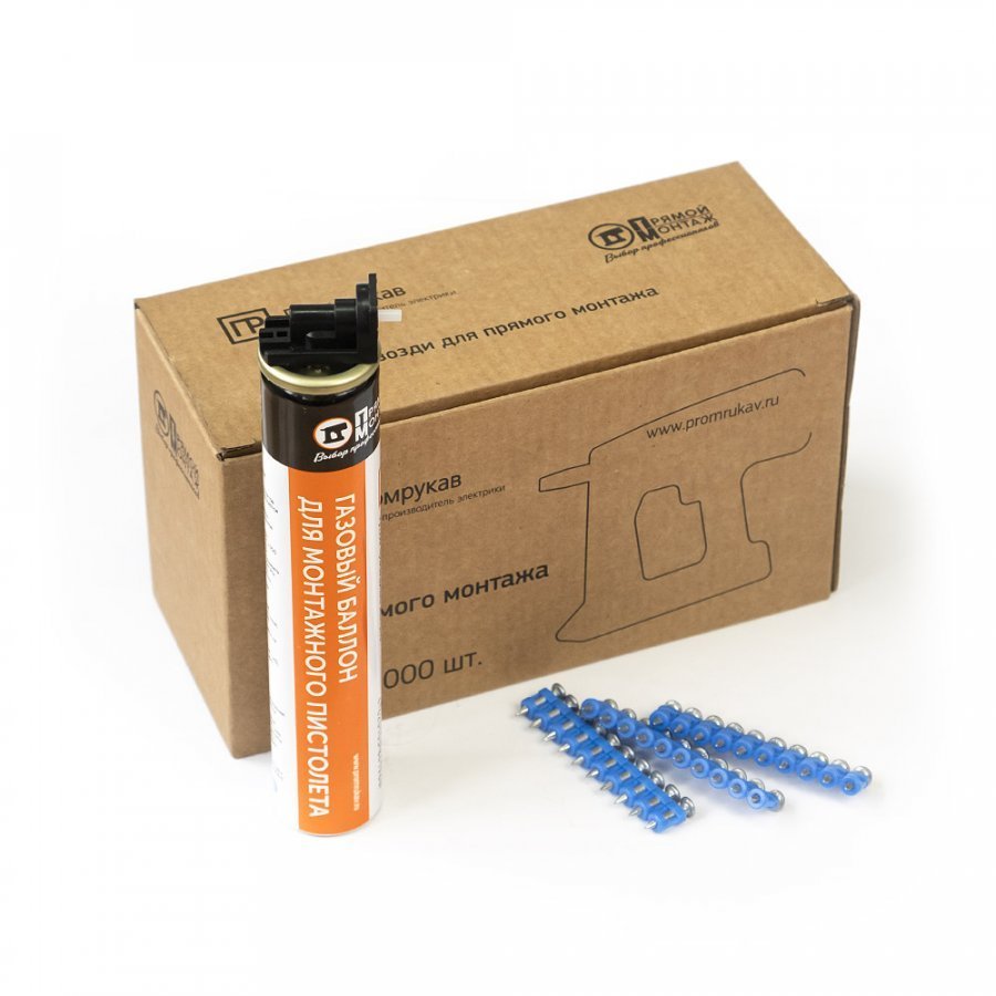 Комплект из газового баллона и гвоздей для прямого монтажа от компании - производителя "Промрукав" предназначен для монтажных пистолетов. Газовый баллон - это основной топливный элемент для газовых гвоздезабивных инструментов. Его длина 165 мм. Он позволяет забить от 1000 до 1400 гвоздей с одного баллона. Баллон предназначен для монтажных пистолетов с энергией выстрела от 80 до 110Дж. Специальная смесь сжиженного газа и лубрикантов позволяет продолжительно использовать инструмент без смазки основных узлов. Гвозди при помощи монтажного пистолета применяются для крепления различных изделий практически к любым несущим поверхностям. Благодаря особенностям конструктива и материала изготовления гвоздей, возможен монтаж изделий не только к бетонным поверхностям различной прочности, но и к кирпичным стенам или металлическим поверхностям толщиной до 5 мм включительно.