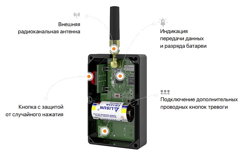 Тревожная кнопка радиоканальная. Кнопка тревожная радиоканальная для работы с приёмником RDK-L производства НПО "РИТМ"; f-раб.868.7...869.2 МГц, P-изл.25 мВт, дальность действия до 25 км (в прямой видимости); 1 ШС для внешней проводной тревожной кнопки; квитирование доставки сообщения; разъем подключения USB1; элемент питания 3 В CR123A; t-раб.-20...+50°С; 81×50×25 мм