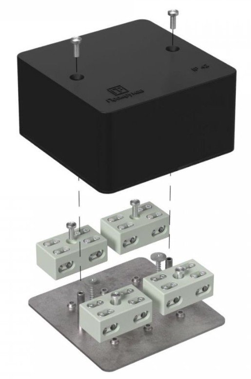 Коробка огнестойкая. Коробка огнестойкая разветвительная для кабель-канала; Е15-Е60; керам.клеммник на 8 полюсов, сечение кабеля до 6.0 мм², парные клеммы для разветвления, безгалогенная (HF); УХЛ4, IP42, t-раб.-25…+40°C, габ.размеры 85х85х45 мм. Цвет черный (RAL 9005).