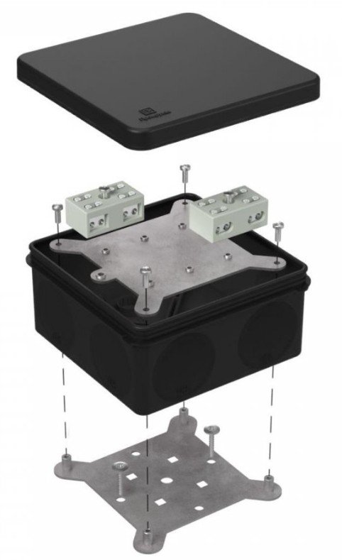 Коробка огнестойкая. Коробка огнестойкая двухкомпонентная разветвительная безгалогеновая (HF), стойкая к УФ; огнестойкость Е15-Е60; 8 мембранных каб.вводов под трубу D25 мм, керам.клеммник на 4 полюса 6.0 мм²; парные клеммы для разветвления, IP66, t-раб.-45…+60°C; габ.размеры 100х100х50 мм, цвет черный (RAL 9005). Подходит для прямого монтажа (пистолетом)