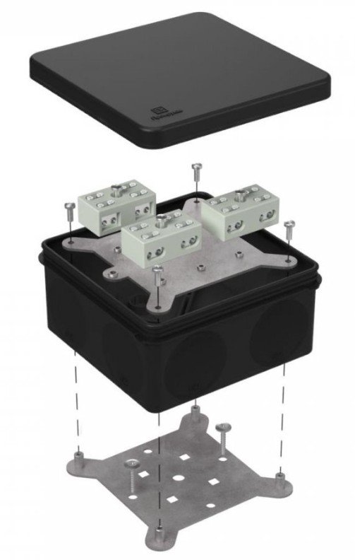 Коробка огнестойкая. Коробка огнестойкая двухкомпонентная разветвительная безгалогеновая (HF), стойкая к УФ; огнестойкость Е15-Е60; 8 мембранных каб.вводов под трубу D25 мм, керам.клеммник на 6 полюсов 6.0 мм²; парные клеммы для разветвления, IP66, t-раб.-45…+60°C; габ.размеры 100х100х50 мм, цвет черный (RAL 9005). Подходит для прямого монтажа (пистолетом)