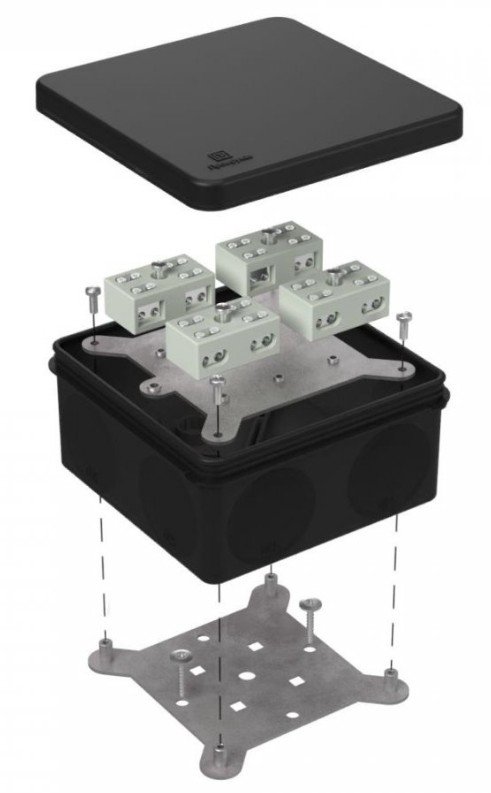 Коробка огнестойкая. Коробка огнестойкая двухкомпонентная разветвительная безгалогеновая (HF), стойкая к УФ; огнестойкость Е15-Е60; 8 мембранных каб.вводов под трубу D25 мм, керам.клеммник на 8 полюсов 6.0 мм²; парные клеммы для разветвления, IP66, t-раб.-45…+60°C; габ.размеры 100х100х50 мм, цвет черный (RAL 9005). Подходит для прямого монтажа (пистолетом)