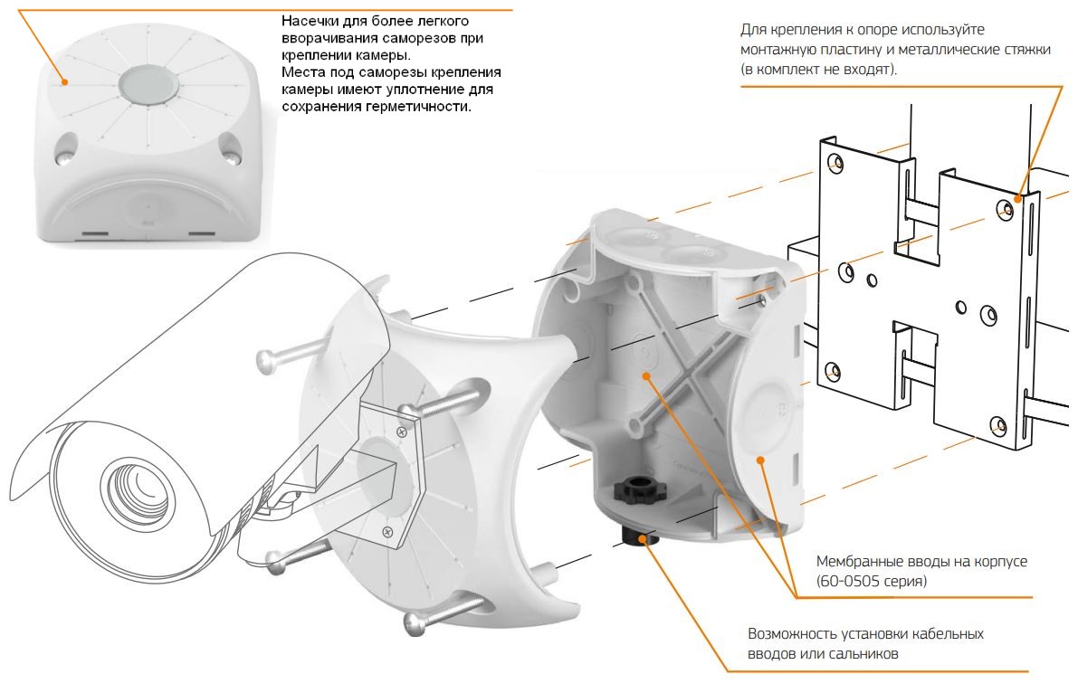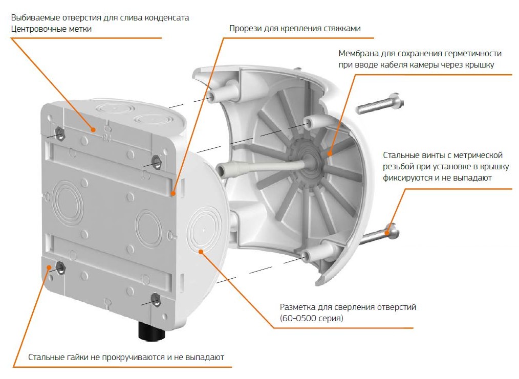 Распределительные коробки для монтажа видеокамер предназначены для применения в системах безопасности и видеонаблюдении. Применяются для защиты мест соединения проводов и кабелей от механических повреждений, вредного воздействия пыли и влаги.Материал изготовления коробок является безгалогенным, что позволяет использовать изделие в общественных местах с высоким скоплением людей.Согласно климатическому исполнению В1, коробка подходит для прокладки на открытом воздухе.Конструкция коробки обеспечивает высочайшую степень защиты IP68 за счёт непрерывного контура уплотнителя и надежного соединения крышки с корпусом.