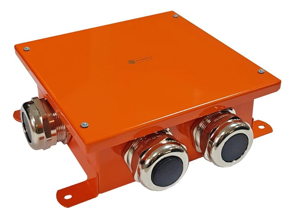 Коробка, огнестойкая. Коробка металлическая открытой проводки 164х164х65 мм, огнестойкость E-110, 1 металлический каб.ввод под кабель D 18-25 мм, 5 металлических заглушек, керамический клеммник 9P ≤2,5 мм², IP66, цвет оранжевый