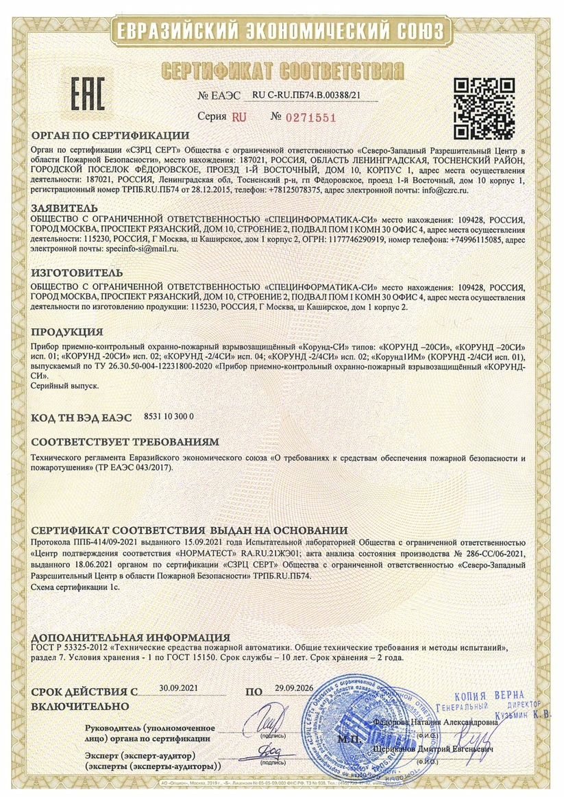 Взрывозащищенный приемно-контрольный прибор «Корунд-1ИМ» предназначен для организации автономной системы пожарной или охранной сигнализации во взрыво-пожароопасных помещениях на объектах с отсутствием дежурного персонала и обеспечивает трансляцию тревожных извещений на ПЦН, оповещение о пожаре или проникновении, автоматическое включение систем пожаротушения, дымоудаления и других устройств пожарной автоматики или технологического оборудования (выбор функционирования шлейфа: пожарный или охранный) осуществляется потребителем с помощью программирующей перемычки).