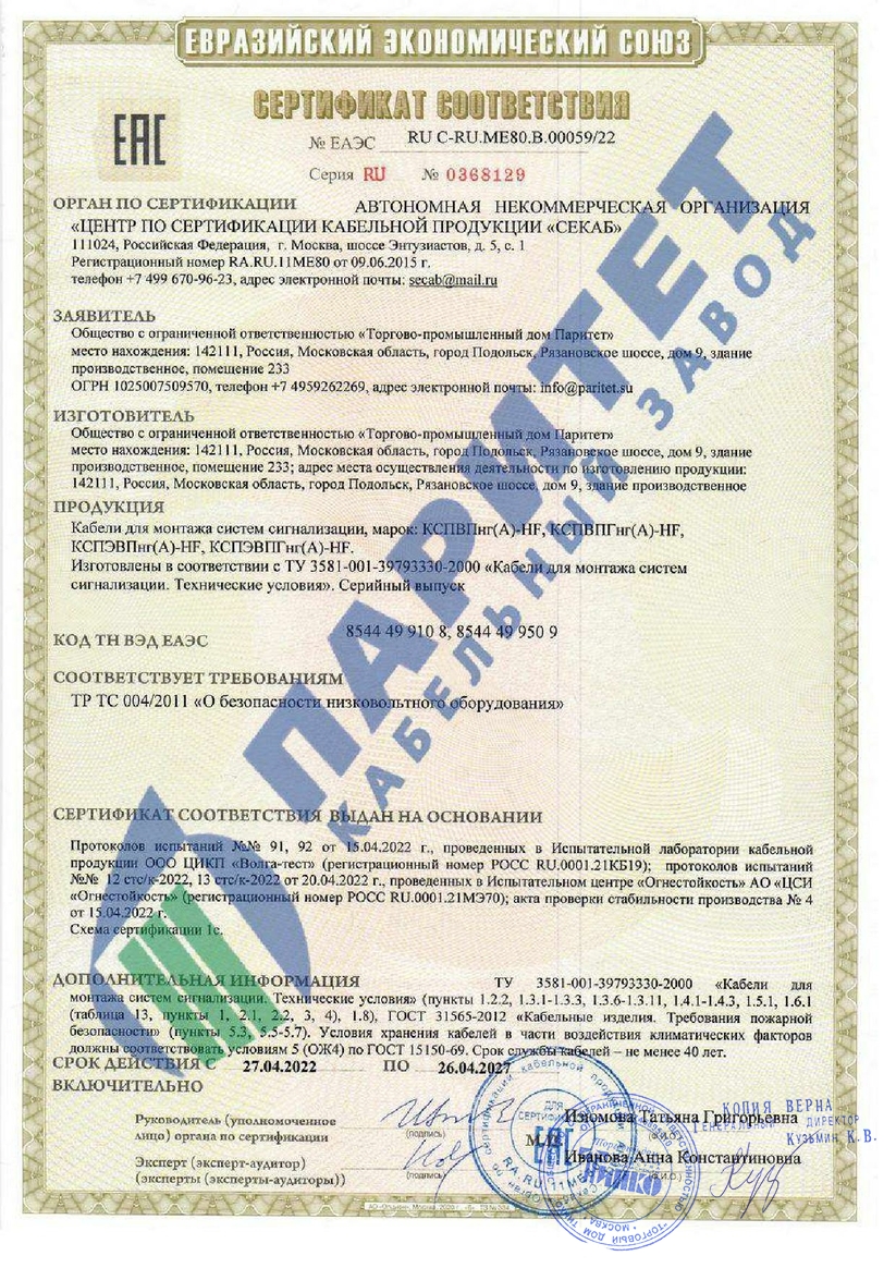 Кабель не распространяющий горение при групповой прокладке, с пониженным дымо- и газовыделением, с пониженной токсичностью продуктов горения. Кабель парной скрутки для сигнализации; медная однопроволочная жила в изоляции из сплошного полиэтилена, D-жил.1.78 мм, S-жил.2.5 мм², D-каб.7.2 мм; в оболочке из термопластичной безгалогенной композиции. Оранжевого цвета.