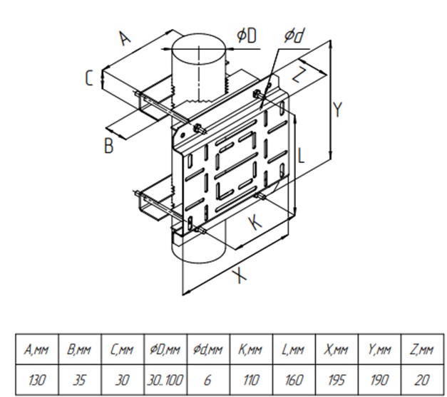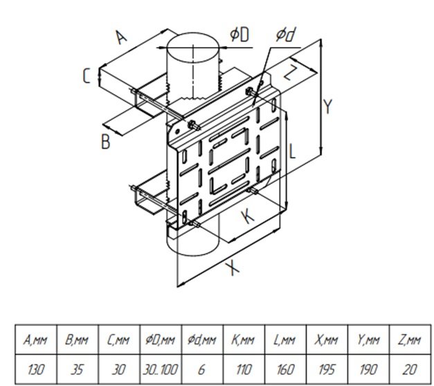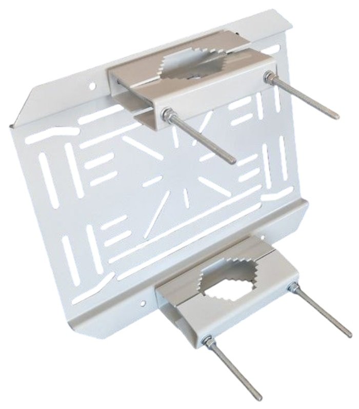 Кронштейн для крепления на столб/трубу. Кронштейн для крепления на столб, трубу или иную опору диаметром 30...100 мм, приборов различного назначения: видеокамер, коробок коммутации, ящиков, источников питания, светильников, устройств оповещения и т.п.; габ.размеры пластины (ШхВ) 195х190 мм, цвет серый.