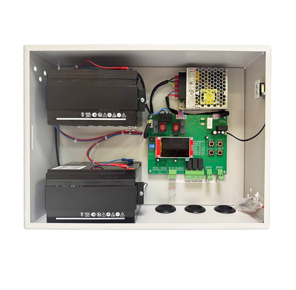 Контроллер управления табло. Контроллер управления табло; 2 входа управления, 2 выхода подключения световых указателей, U-вых.24 В, I-вых.500 мА; 5 выходов "СК", U-коммут.120 В, I-коммут.500 мА; U-пит.220 В, под два АКБ 12 В 12 А·ч; t-раб.0…+40°C, 405х305х125 мм.