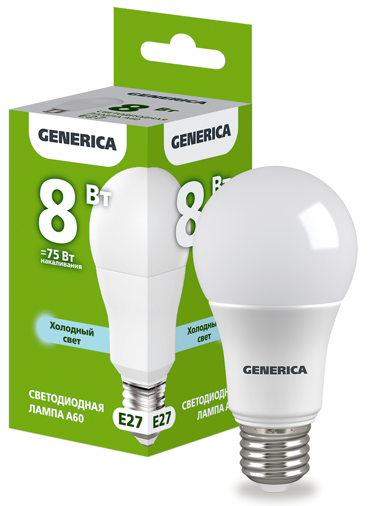 Лампа светодиодная A60 груша 8Вт 230В 6500К E27 GENERICA (LL-A60-08-230-65-E27-G)