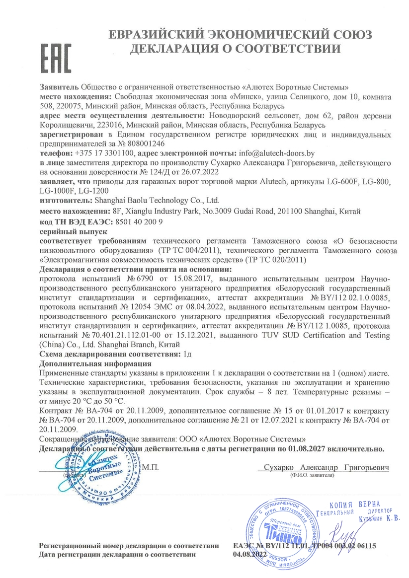Привод ALUTECH Levigato LG-800 предназначен для автоматизации гаражных ворот площадью до 11,2 м². Максимальная скорость открытия — 0,15 метра в секунду.