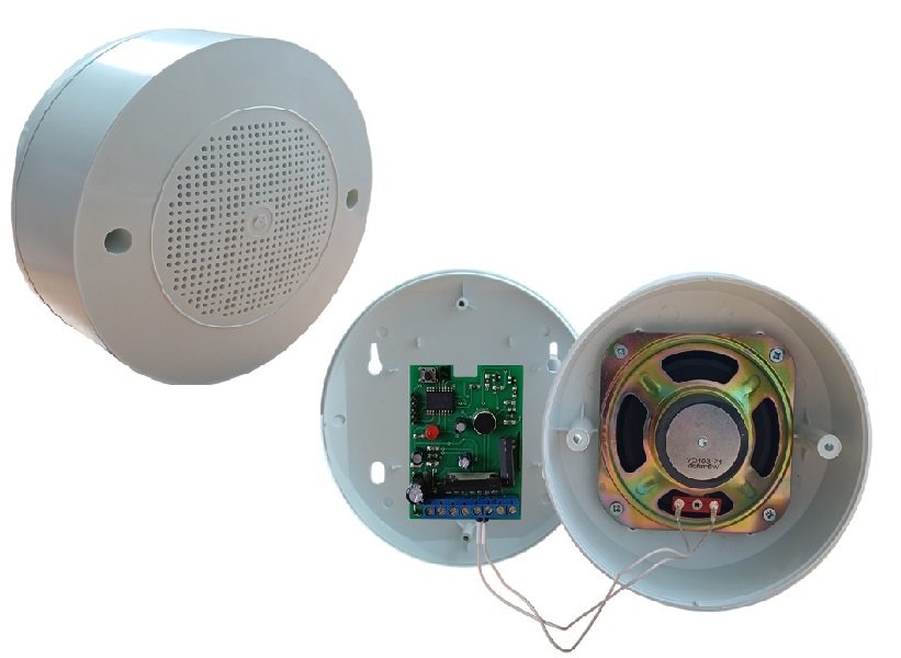 Оповещатель речевой. Оповещатель пожарный речевой со встроенной акустической системой и имеет возможность записи речевого оповещения. Возможна запись речевого сообщения длительностью до 16 секунд. Контроль линии оповещения. Возможность подключения трех дополнительных колонок типа АС-У-5М. 10.5 - 14В, 5Вт, 200-5000Гц, IP41, -10...+55°C, D 155х78 мм