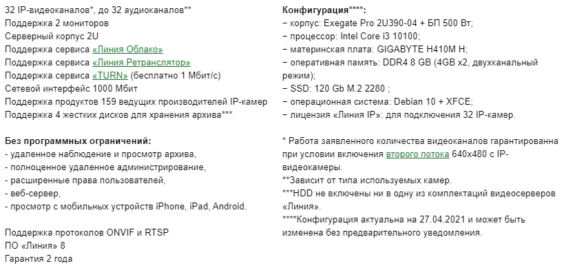 IP-видеосервер 32-канальный. Видеорегистратор IP 32 канальный до 10 Мп; по протоколу ONVIF/RTSP; H.265, H.264, MJPEG; 1хVGA; 1хHDMI независимые; 4 HDD 3.5" до 12Тб; 1хRJ-45 10/100/1000 Ethernet TCP/IP, RSTP (прием/передача), DNS, DDNS, NTP, SMTP, FTP, SMB, HTTP; ПО «Линия» 8 версия; полноценное локальное и удаленное администрирование, Web-сервер на базе HTML5, Аналитика: объектно ориентированный детектор движения по всем каналам, Линия Облако,USB: 6x 2.0; 2x3.2; 1x PS/2; 3x Audio jack, АС 220В; +5°...+50°C; 425х483х89 мм. Монтаж в 19" стойку.