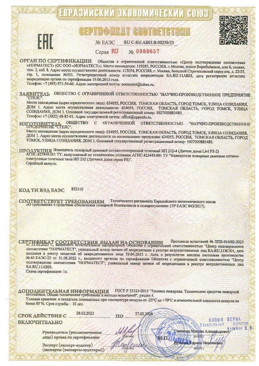 Livi FS-2 обнаруживает в закрытых помещениях возгорания, сопровождающиеся задымлением. Соответствует требованиям ТР ЕАЭС 043/2017, ГОСТ Р 53325-2012 (раздел 4). Livi FS-2 регистрирует оптическое излучение, отраженное от частиц дыма. В извещателе используется симметричная дымовая камера, которая фиксирует дым по всем направлениям. Для исключения ложных срабатываний применяется система отражателей, которая позволяет обнаруживать частицы дыма даже в условиях высокой фоновой освещенности. В устройстве применяется алгоритм компенсации запыленности дымовой камеры. Это позволяет увеличить межсервисный интервал обслуживания датчика и запланировать своевременное сервисное обслуживание при превышении порогов загрязнения.Для обнаружения попыток несанкционированного вскрытия корпуса используется встроенный тампер. Встроенный зуммер позволяет включить локальное звуковое оповещение при обнаружении задымления. Два светодиода обеспечивают визуальный контроль параметров работы извещателя.