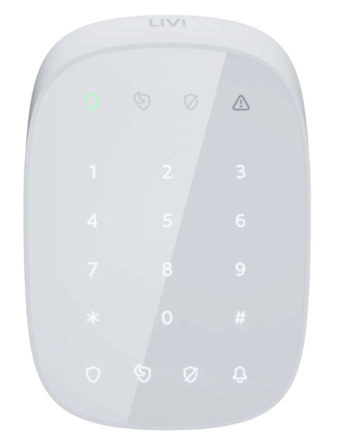 Сенсорная клавиатура Livi Keypad K управляет режимами охраны, исполнительными устройствами, запускает сценарии и отправляет сигнал SOS. Имеет светодиодную подсветку, оповещает о постановке и снятии с охраны встроенным зуммером. Легко крепится к стене благодаря крышке-кронштейну.