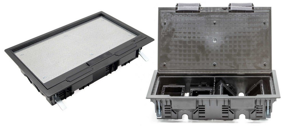 Лючок напольный. Лючок напольный c изменяемой глубиной, 16 модулей ЭУИ (Avanti, Viva, Brava, 45х45 (Mosaic), пластик, глубина выемки в полу: 108 мм, мин. глубина встраивания: 72 мм, размер 360х240х90 мм, IP53, цвет черный (RAL9005). Каркасы и рамки для ЭУИ поставляются отдельно