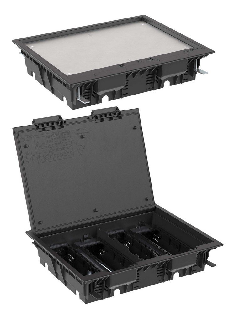 Лючок напольный. Лючок напольный c изменяемой глубиной, 24 модулей ЭУИ (Avanti, Viva, Brava, 45х45 (Mosaic), пластик, глубина выемки в полу: 108 мм, мин. глубина встраивания: 72 мм, размер 350х284х90 мм, IP53, цвет черный (RAL9005). Каркасы и рамки для ЭУИ поставляются отдельно