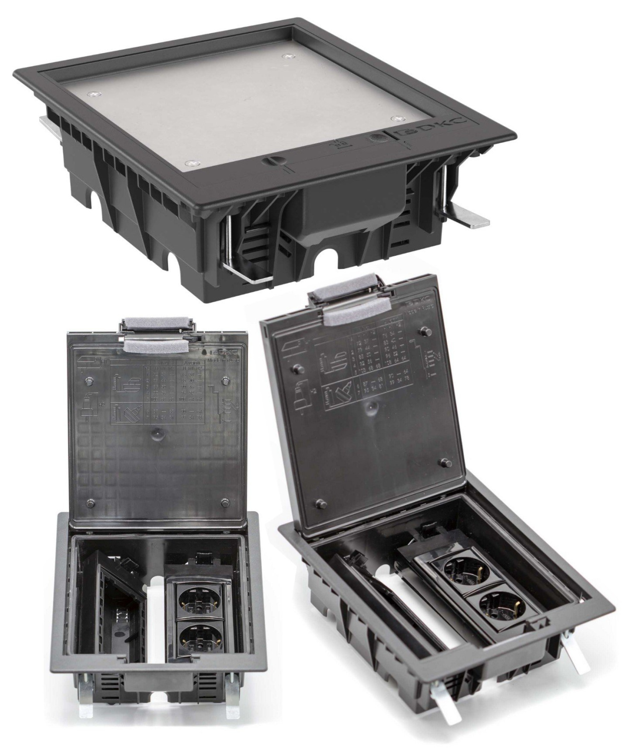 Назначение: организация рабочих мест в помещениях с открытым пространством. Установка производится в плиты фальшпола толщиной от 20 до 45 мм. Отверстие для монтажа 218×182 мм. Глубина монтажа от 73 до 108 мм. Крышка открывается под углом 110˚, "утоплена" ниже уровня пола для монтажа напольного покрытия толщиной до 8 мм. Крышка усилена стальным листом, нагрузка - 450 кг. Ручка с запорным механизмом c двумя положениями: открыто/закрыто. В лючок возможна установка ЭУИ "Viva", "Avanti" от ДКС и изделий стандарта 45х45. Монтаж в два подрозеточных блока на 4 модуля каждый. Комплект поставки: лючок 8 модулей, основание и дно подрозеточного блока 4 модуля – 2 комплекта, винт M4x35 – 4 шт., крепежный элемент 4 шт. – 1 упаковка. Каркасы и рамки для ЭУИ заказываются дополнительно. Цвет - черный.
