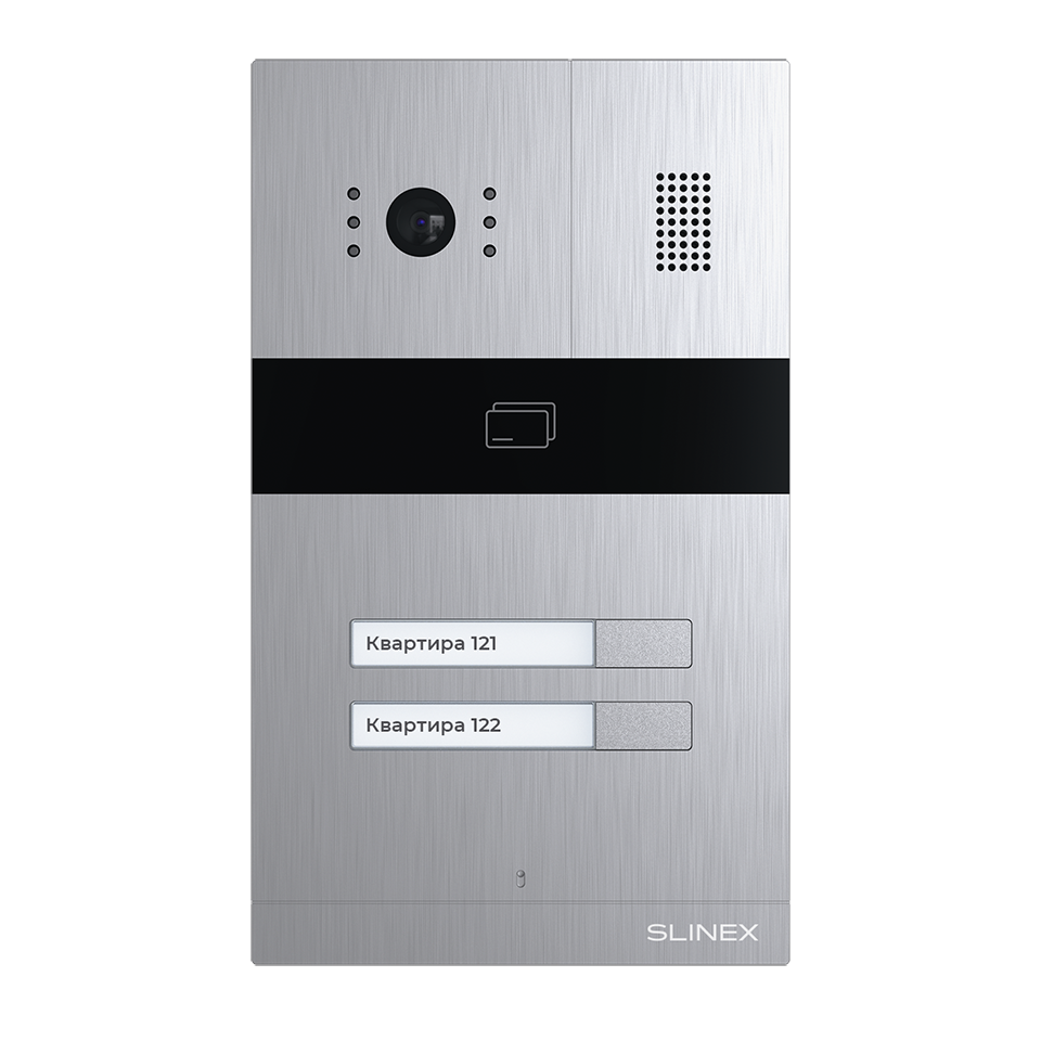 Вызывная панель цветная накладная. AHD вызывная видеопанель на 2 абонента со встроенным контроллером и комбинированным считывателем бесконтактных карт. Цветная матрица CMOS, разрешение 2,0 Мп (AHD)/1 Мп (AHD)/960 ТВЛ (CVBS), угол обзора: 115° по горизонтали, минимальная освещенность: 0,01 Люкс (ИК подсветка до 1,5 м). Кнопка переключение режима камеры. Механический ИК фильтр, подсветка кнопок. Встроенный считыватель карт: EM-Marin и Mifare. Количество идентификаторов: 248 шт. Выход Wiegand-26. НО/НЗ контакт реле, IP65, -40...+65°C, +12 В (от монитора), 110х186х32 мм. Врезная установка. Цвет: серебро.