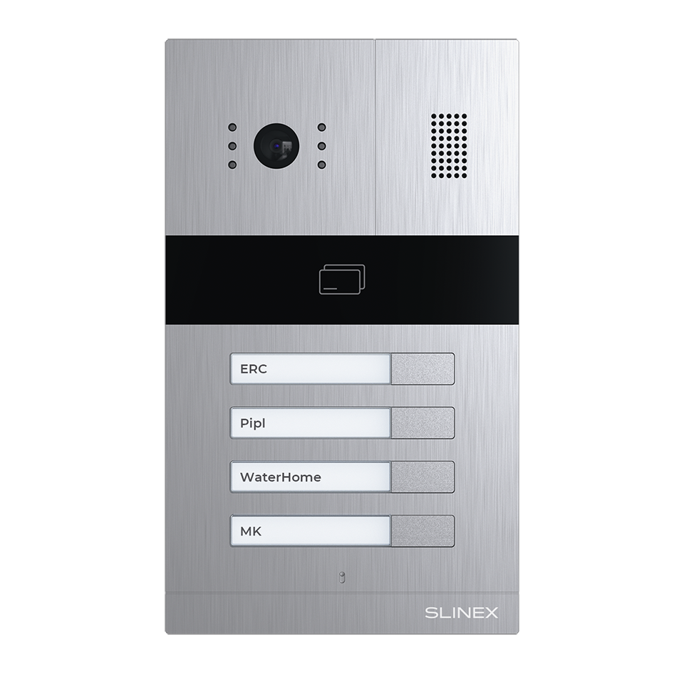 Вызывная панель цветная накладная. Цветная вызывная видеопанель на 4 абонента со встроенным контроллером и считывателем EM-Marin и Mifare. Матрица CMOS 1/2,9" с механическим ИК фильтром, AHD 1080p (2 Мп)/AHD 720p (1 Мп)/PAL (960 ТВЛ), угол обзора: 115°. Память: 248 идентификаторов. Выход Wiegand-26. Подсветка именных табличек абонентов, врезная установка. НО/НЗ контакт реле. Питание: 12В, 500мА, IP65, -40...+50°C. Размеры: 110х185х34 мм. Цвет: серебро.