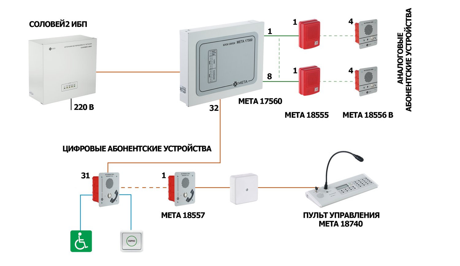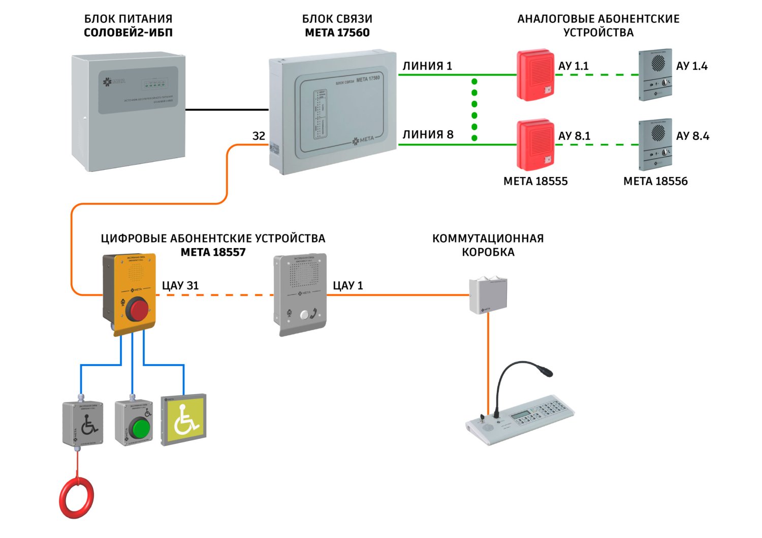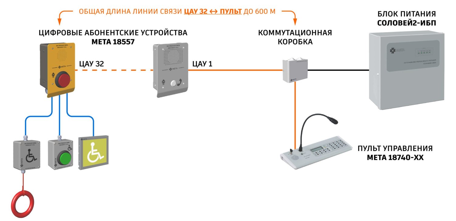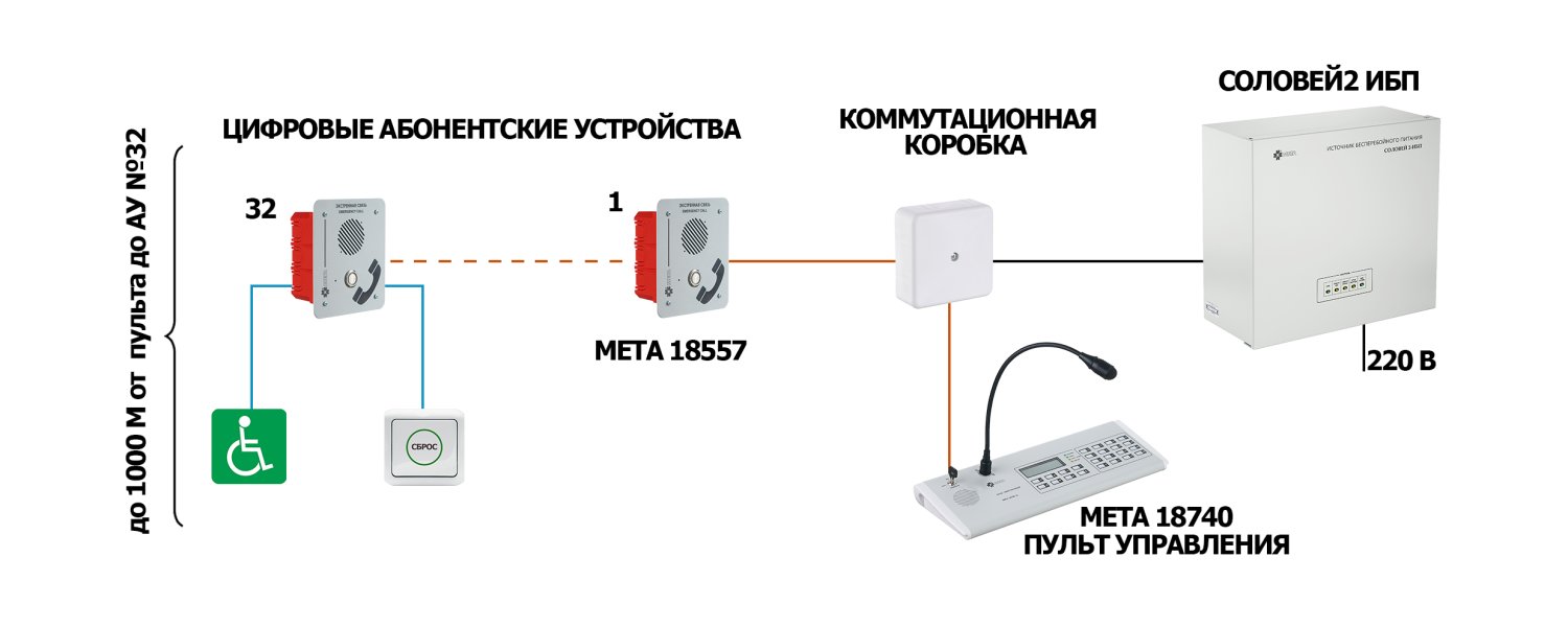 Функциональные возможности● Полудуплексная связь● До 2-х микрофонных пультов в системе● Подключение до 256 независимых цифровых абонентских устройств● Подключение до 1024 аналоговых абонентских устройств (256 независимых линий)● Возможность подключения светозвуковых оповещателей и кнопок сброса для МГН● Контроль целостности линий● Индикация сигнала «НЕИСПРАВНОСТЬ» по каждой линии связи● Контроль линий речевых и световых оповещателей на КЗ и обрыв● Индикация сигнала «ВЫЗОВ» по каждой линии связи● Сигнал «НЕИСПРАВНОСТЬ» во внешние цепи● Контроль линий от ППК на КЗ и обрыв● Сигнал «НЕИСП РАВНОСТЬ» во внешние цепи● Сигнал «ЗАПУСК СИСТЕМЫ» во внешние цепи● Гибкая настройка с ПКСостав системы:Пульт микрофонный МЕТА 18740Блок связи МЕТА 17560Блок усиления МЕТА 17661Источник бесперебойного питания Соловей2‑ИБПАбонентское устройство МЕТА 18555Абонентское устройство МЕТА 18556 исп. УАбонентское устройство МЕТА 18556 исп. НАбонентское устройство МЕТА 18556 исп. ВАбонентское устройство МЕТА 18557 исп. ВАбонентское устройство МЕТА 18557 исп. В1Абонентское устройство МЕТА 18557 исп. НАбонентское устройство МЕТА 18557 исп. УАбонентское устройство МЕТА 18557 исп. МГНУстройство сброса МЕТА 7520Устройство вызова МЕТА 7521Звуковое и визуальное аварийное сигнальное устройство МЕТА 7523
