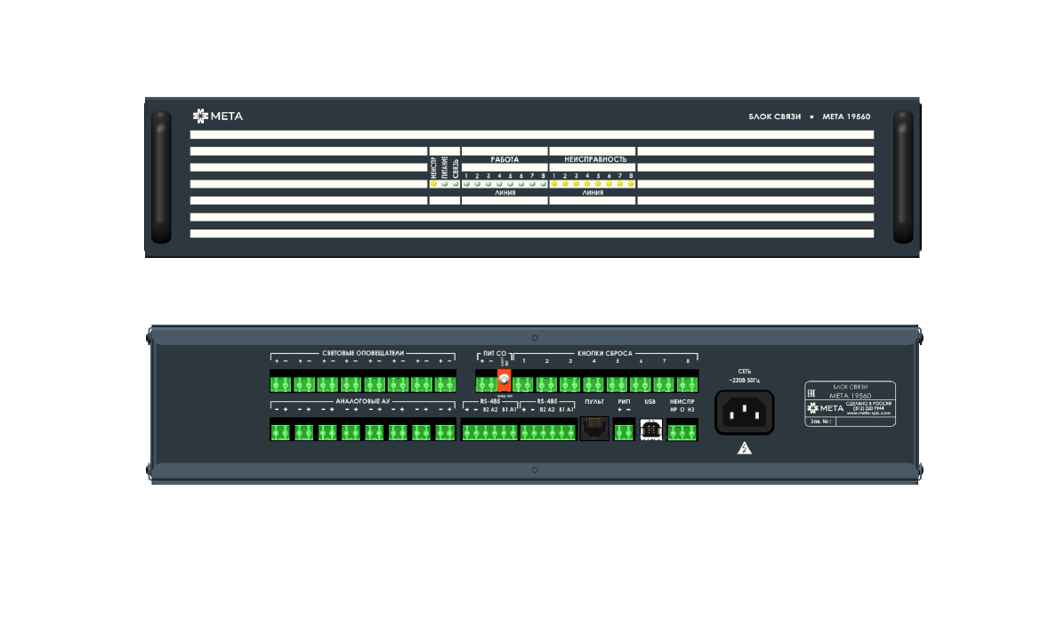 Блок связи, 8 каналов, монтаж в стойку. Блок связи МЕТА 19560 обеспечивает передачу звукового сигнала от абонентских устройств на пульт микрофонный МЕТА 18740-хх, который является главным устройством в составе системы обратной связи и обеспечивает двухстороннюю связь зон пожарного оповещения с помещением пожарного поста/диспетчерской при организации системы оповещения и управления эвакуацией 4-го и 5-го типа., 8 каналов, монтаж в стойку;1300 мА; 482х275х88 мм; 4,9 кг