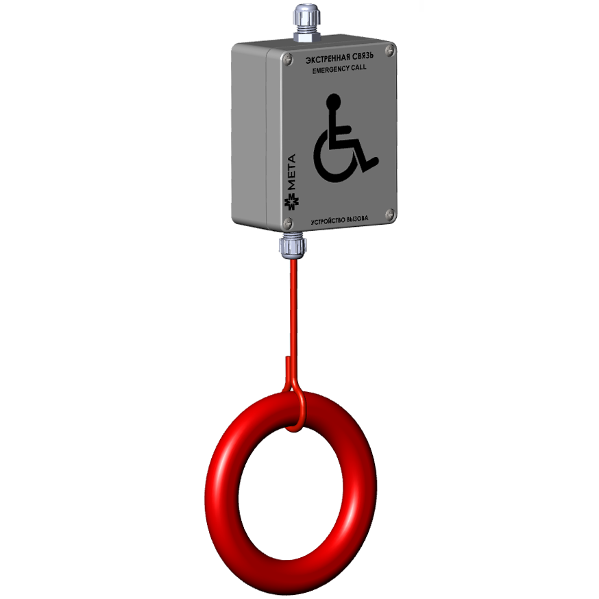 Устройство вызова (со шнурком). Устройство вызова (со шнурком). Длина шнура 5 м. Используется в составе системы обратной связи для МГН на базе микрофонного пульта МЕТА 18740. Подключается непосредственно к абонентскому устройству МЕТА 18557 исп. МГН. IP 54, Пластик, 159х90х55 мм.