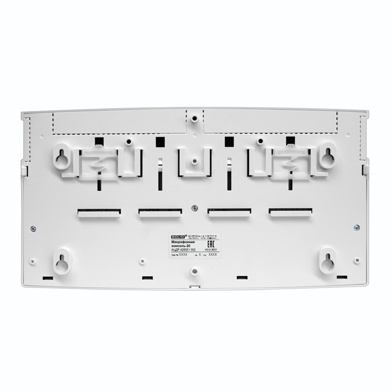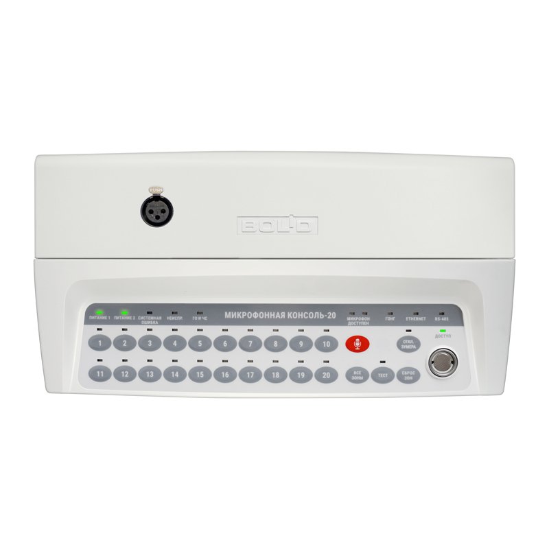 Микрофонная консоль. Микрофонная консоль на 20 зон для работы в СОУЭ на базе блоков «Рупор-300» в составе ИСО «Орион»; 2 порта Ethernet Poe, P-потр.5 Вт; 2 х RS-485; линейный вход ГОиЧС, вход включения оповещения, выход квитирования; 2 входа питания, U-пит.10.2...28.4 В, I-потр.450 мА(max); IP20, t-раб.-30...+50°С, 332×177×480 мм