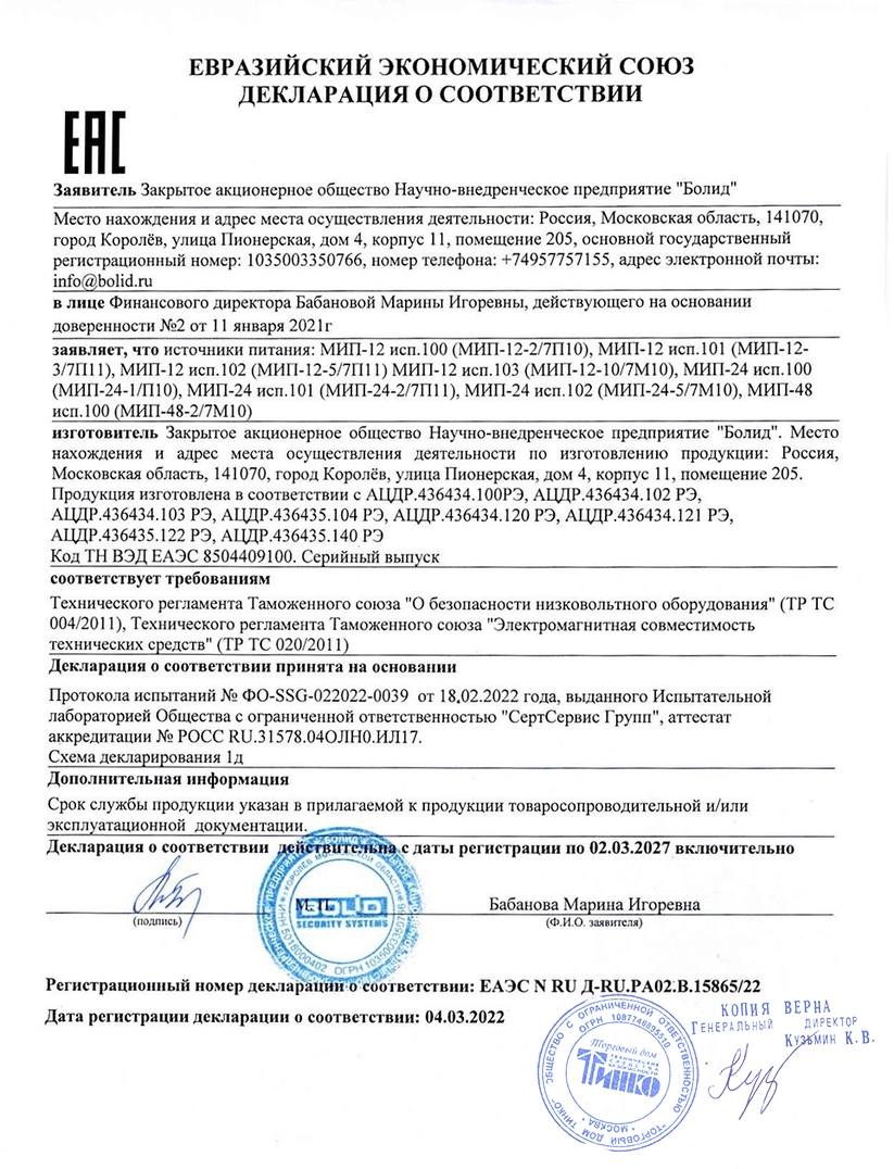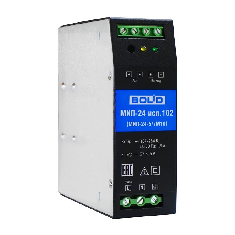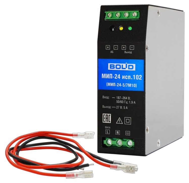 Модуль источника питания. Резервированный источник питания; U-вх.187…264 В, U-вых.27±2% В, I-max.5 А, под два внешних АКБ 12 В 4.5…12 А·ч; световая индикация режимов работы, электронная защита от короткого замыкания, защита аккумулятора от глубокого разряда; IP20, t-раб.-20…+45°С, 43×124×113 мм. Крепление на DIN-рейку.