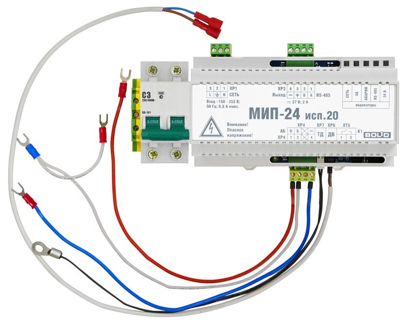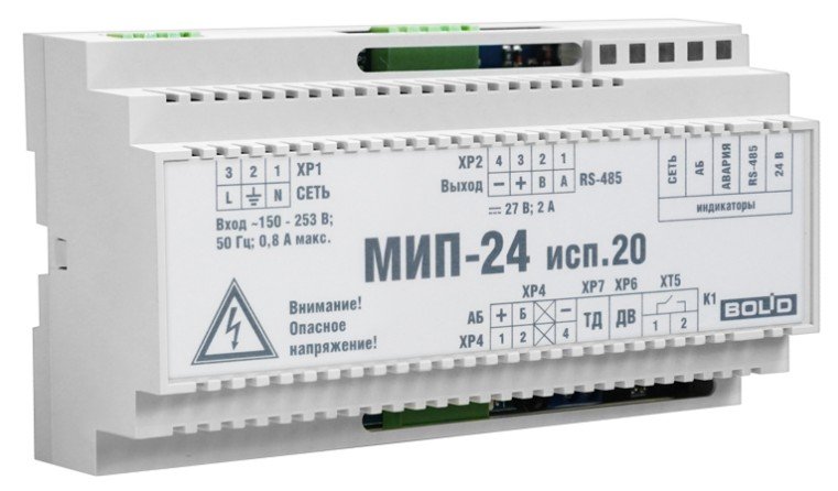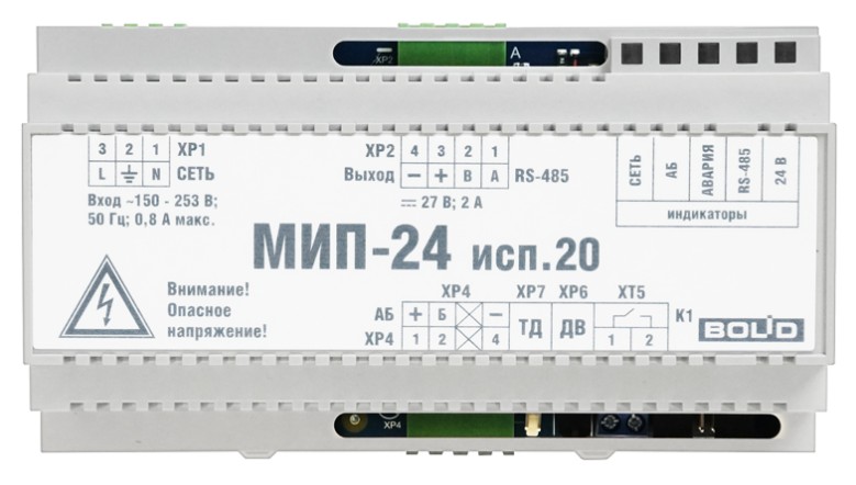 Модуль источника питания. Модуль источника питания для размещения в монтажных устройствах с установкой на DIN-рейку; U-вх.150…250 В, U-вых.27.2±0.6 В, I-ном.2 А, I-макс.2.2 А, под два АКБ 12 В 17 А·ч; RS-485, 1 релейный выход "НЕИСПРАВНОСТЬ" (оптореле); IP20, t-раб.-10…+40°С, 156×86×58 мм