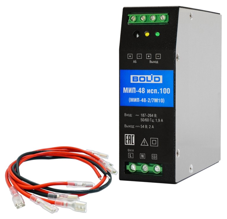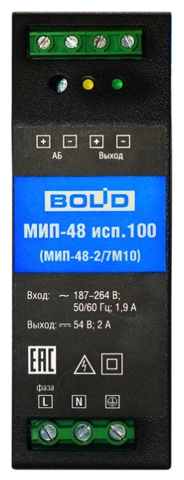 Модуль источника питания. Резервированный источник питания; U-вх.187…264 В, U-вых.54±2% В, I-max.2.5 А, под четыре внешних АКБ 12 В 4.5…12 А·ч; световая индикация режимов работы, электронная защита от короткого замыкания, защита аккумулятора от глубокого разряда; IP20, t-раб.-20…+45°С, 43×124×113 мм. Крепление на DIN-рейку.
