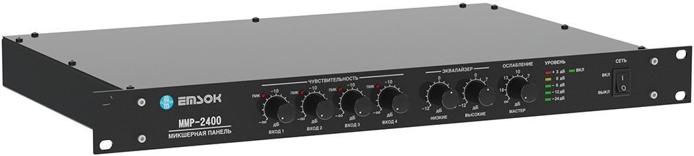 Микшерная панель. Микшерная панель для согласования и усиления сигналов от внешних источников, 4 комбинированных входа, 1 выход, 20...20000 Гц, 24/220 В, 6 Вт, 483х44х310 мм, 1 U, 4 кг