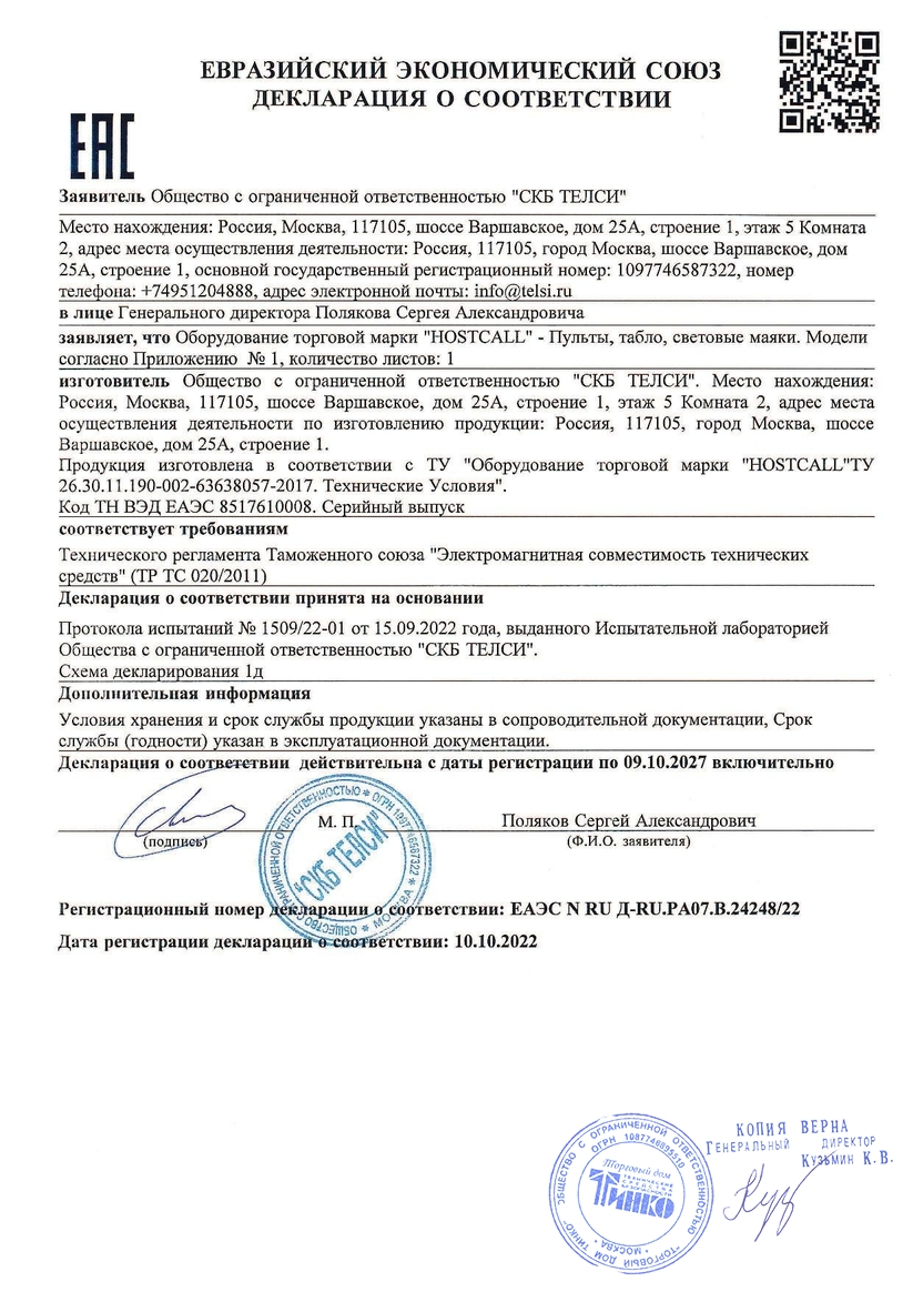 Сенсорный пульт. Моноблок настольного исполнения с LCD экраном. Экран 8,9" (1920x1200), процессор Intel 2,16 Ггц, встроенная память 32 Гб, оперативная память 2Гб. Предустановленная операционная система Windows 10 и программное обеспечение «HostСall-Nurse». Для подключения к шине RS-485 используется преобразователь интерфейса MP-251W4 (RS-485/LAN). В комплекте блок питания 12 В/2,4 А