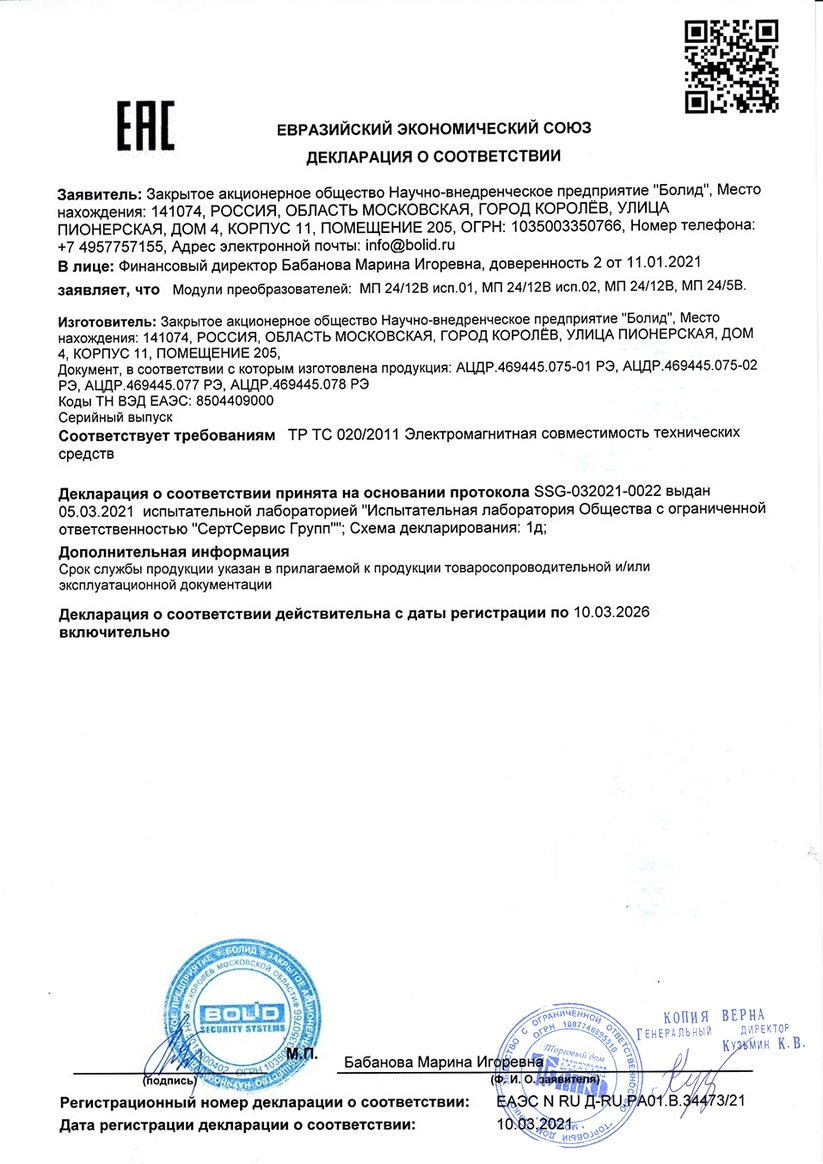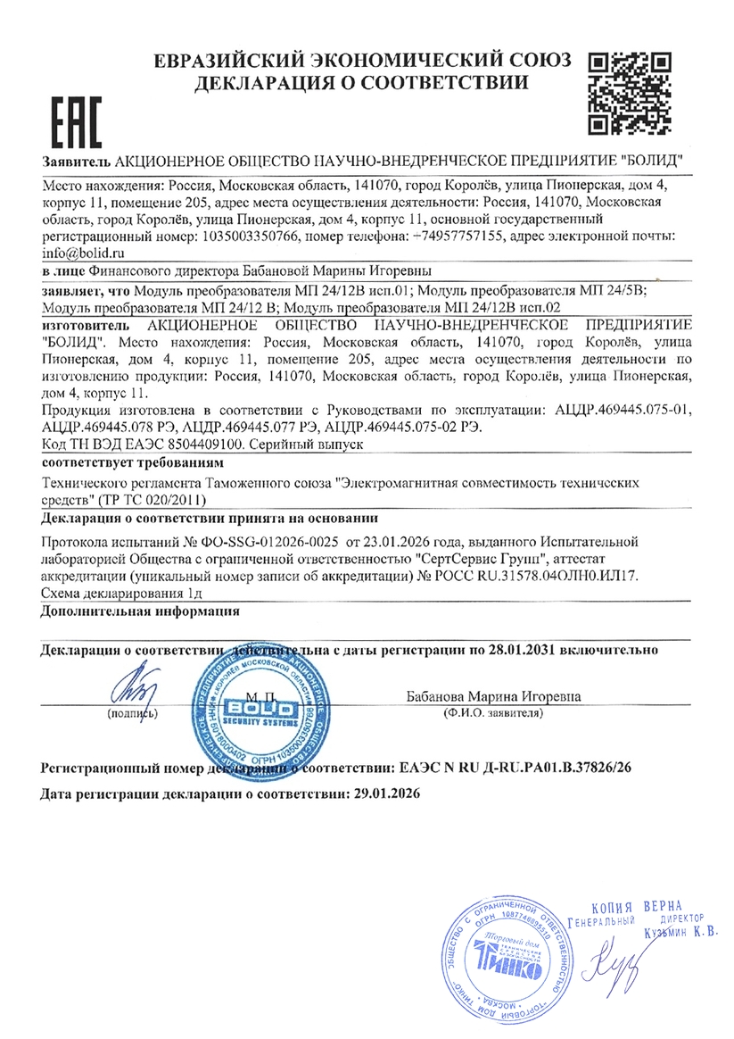 Модуль преобразователя МП 24/5 В предназначен для питания устройств охранно-пожарной сигнализации напряжением 5 В постоянного тока.