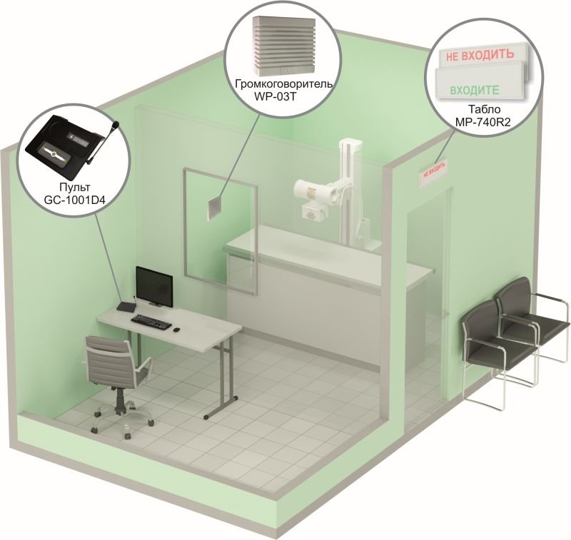Комплект светового, звукового и голосового вызова посетителя в кабинет. Комплект вызова для светового и звукового информирования о занятости и освобождении сотрудников в кабинетах, голосового вызова посетителей в кабинет. В комплекте: пульт GC-1001D4, микрофон GC-0005B2, светозвуковое табло MP-740R2, громкоговоритель WP-03T, блок питания 12 В/0,3 А, кабель соединительный (UTP 4х2х0,5) длиной 12 м, розетка RJ-45.