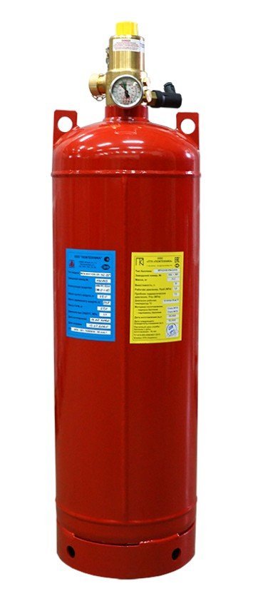 Модуль газового пожаротушения. Модуль газового пожаротушения; Р-раб. 30 кгс/см²; вместимость 32 л; ЗПУ Ду 25 мм, реле давления; сварной баллон; габ.размеры D254х925 мм, масса без ГОТВ 26 кг
