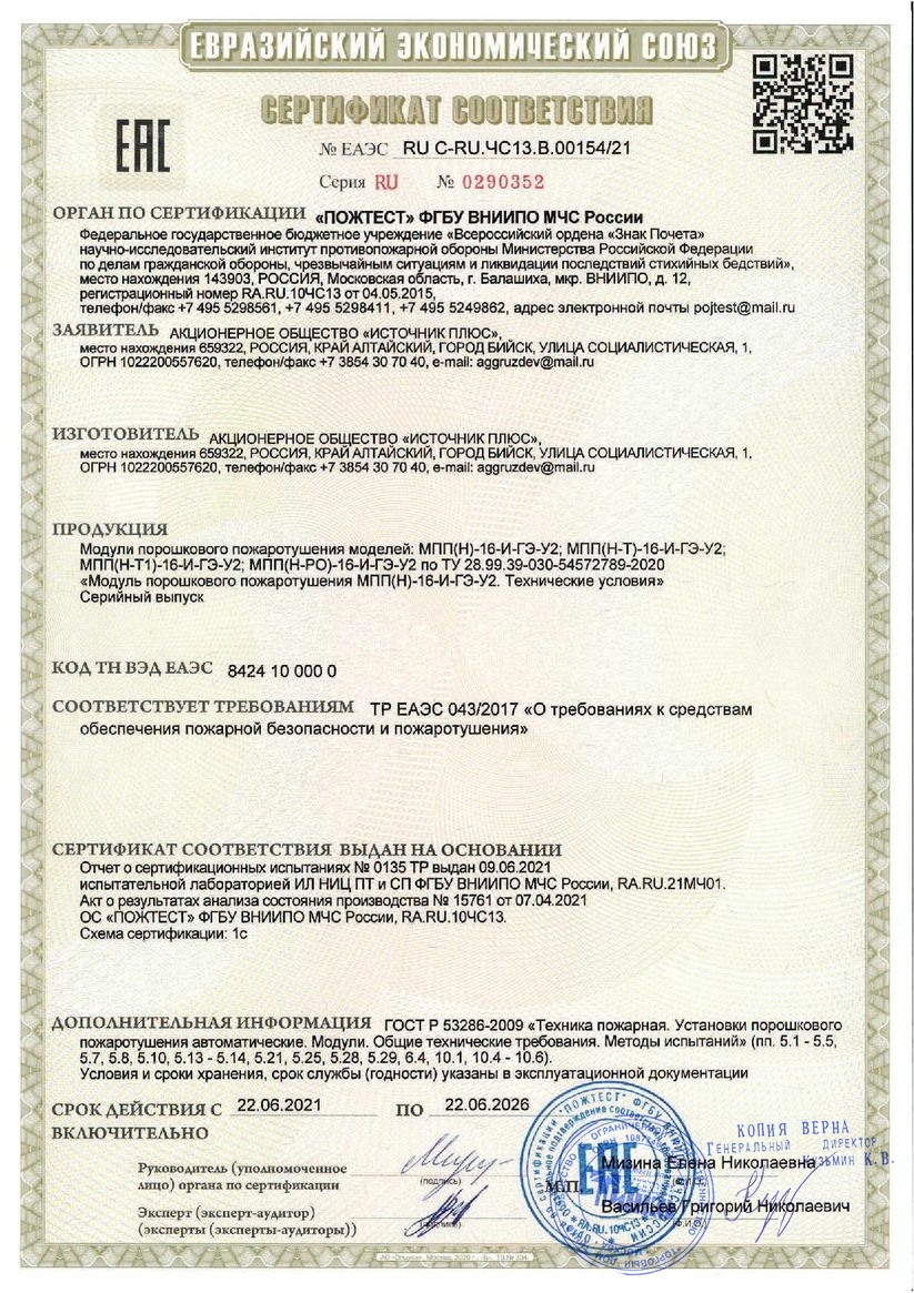 Модуль порошкового пожаротушения МПП(Н)-16-И-ГЭ-У2, предназначен для автоматического подавления очагов пожара классов А (твердых веществ), В (жидких веществ), С (газообразных веществ) и Е (электрооборудования, находящегося под напряжением без учёта параметра пробивного напряжения огнетушащего порошка).