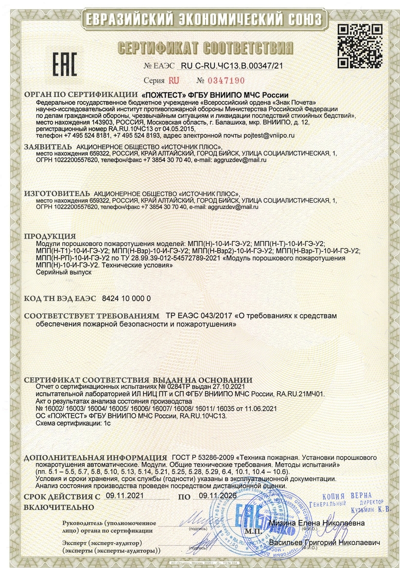 Модуль порошкового пожаротушения взрывозащищенный. Модуль порошкового пожаротушения взрывозащищенный потолочный; 0Exia IIB T3 Gа Х; масса ОТВ 9.5 кг, инерционность срабатывания 3...10 сек, время действия 1 сек, S-защ. 36 м² (для пожара класса А); V-защ. 216 м³ (для пожаров класса А); I-пуск. 150 мА; IP67, t-раб.-50...+50°С, габ.размеры Ø240х379 мм, вес 18 кг