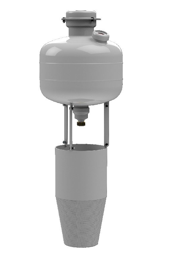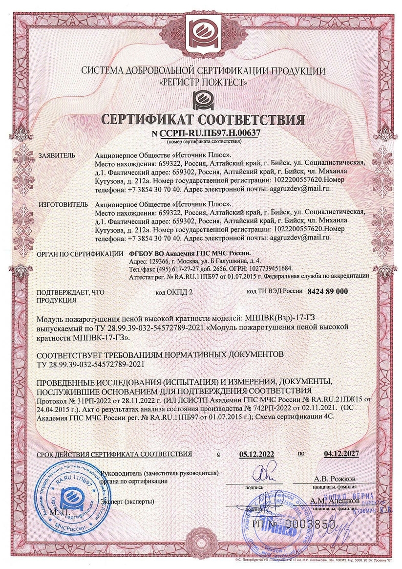 Модуль пожаротушения пеной высокой кратности. Модуль пожаротушения пеной высокой кратности для тушения пожаров класса А, В; объем ОТВ 17 л, S-защ. 14 м²; V-защ. 7.8 м³, высота уст. от 2 до 6 м, время выпуска ОТВ 180 с, кратность пены не менее 550; I-пуск. ≥0,15 А, R-цепи пуска 8…16 Ом; IP65 для вводной коробки и IP67 для корпуса МППВК, t-раб. +5…+50°С; потолочное крепление, габ.размеры Ø340х952 мм, масса с ОТВ 31 кг