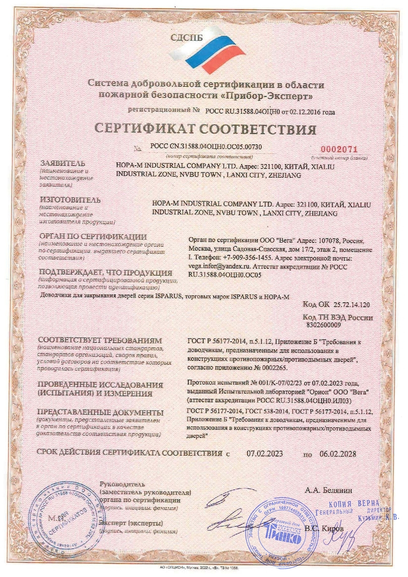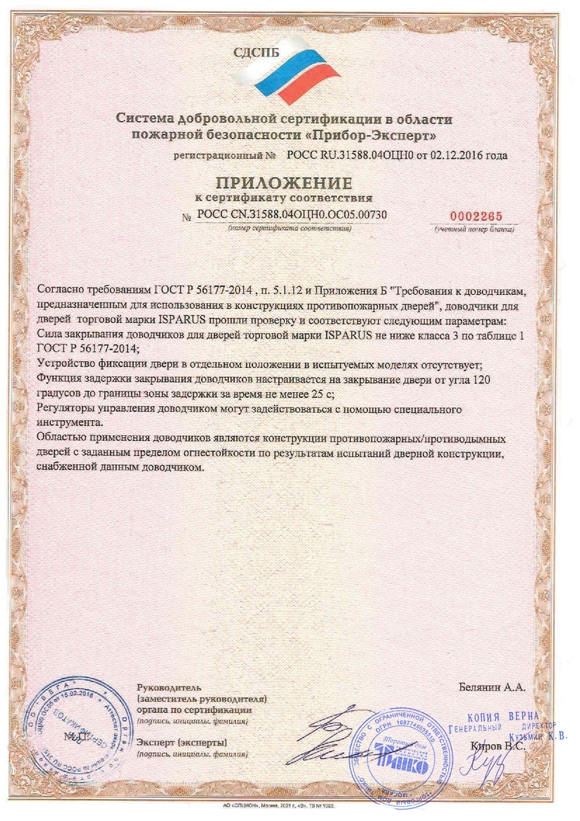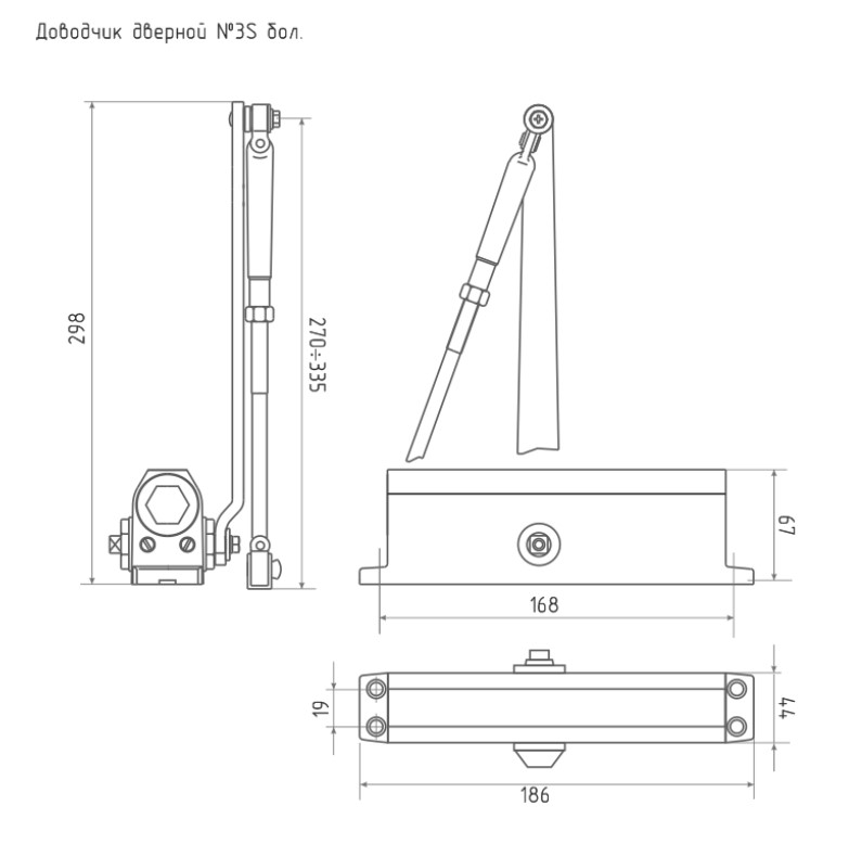 Доводчик предназначен для дверей весом 50–80 кг, изготовленных из дерева, пластика, стекла, а также для лёгких металлических дверей. Рекомендуется как для межкомнатных, так и для нетяжёлых входных дверей. Длина рычага этой модели позволяет использовать изделие на дверях с полотном нестандартной ширины. Угол открытия двери может меняться от 90˚ (при ширине дверного полотна 1100 мм и его весе 80 кг) до 180˚ (при ширине 950 мм и весе 60 кг).