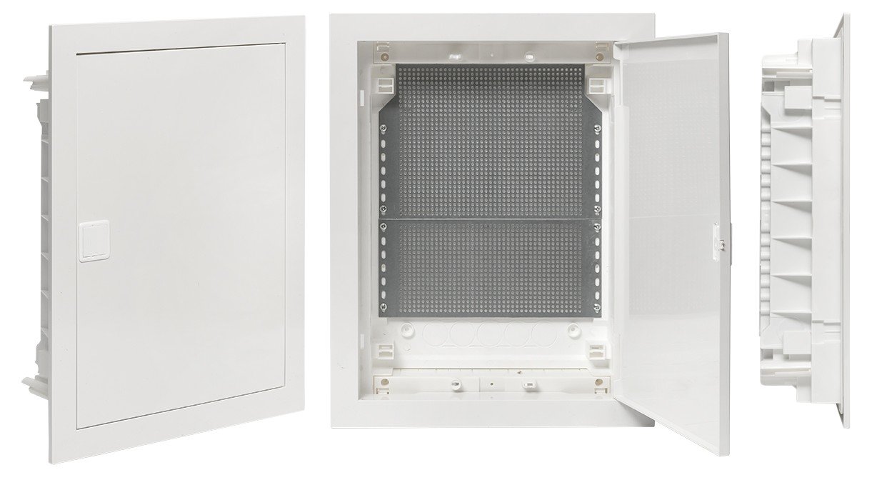 Щит слаботочный. Щиток слаботочный серии Nova с 2-мя монтажными панелями (172х250 мм + 110х250 мм) для установки антенных разветвителей, Wi-Fi роутеров, патч-панелей и т.д., встраиваемый, корпус АБС-пластик, U-номин. 400 В, I-номин. 63 А, УХЛ3, IP41, габ.размеры 400х315х90 мм, цвет белый RAL 9010