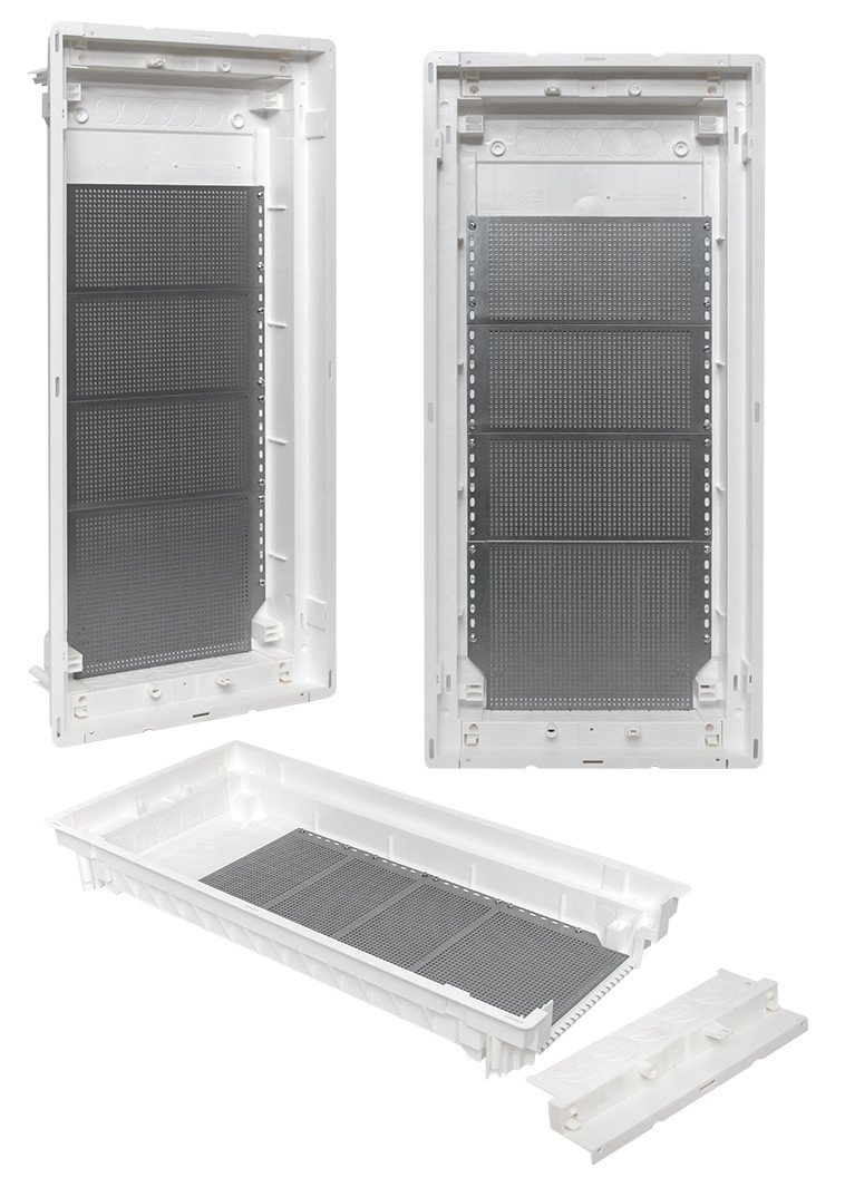 Корпуса пластиковые серии «Nova» предназначены для сборки силовых, слаботочных и комбинированных щитов. На DIN-рейки устанавливается модульное оборудование. На монтажные платы – антенные разветвители, Wi-Fi роутеры, патч-панели и иное слаботочное оборудование. Щиты устанавливаются как в бетонные и кирпичные стены, так и в гипсокартон, монтажные комплекты для установки в гипсокартон входят в комплектацию оснований щитов либо в комплектацию щитов в сборе. Двери щитов можно выбрать их разных материалов – пластик, металл или металл с перфорацией. Также доступны дополнительные аксессуары, необходимые для установки мультимедийного оборудования и существенно упрощающих монтаж щитов. Есть возможность приобрести как отдельно основание щита и дверь, так и основание с дверью в комплекте в одной коробке. Основные преимущества: съемные шасси с din-рейками, съемные кабельные фланцы, гребенка для фиксации входящих проводников, регулировка дверей по глубине, современный минималистичный дизайн