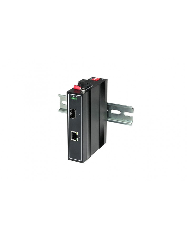Медиаконвертер оптический. Промышленный медиаконвертер Gigabit Ethernet, 1xRJ4510/100/1000 Мбит/с, 1xSFP 1000 Мбит/с, вход для резервного питания, грозозащита, DC12-36В, 5Вт БП в комплект НЕ входит, монтаж на DIN-рейку, -40…+85°С, 30x90x120мм.