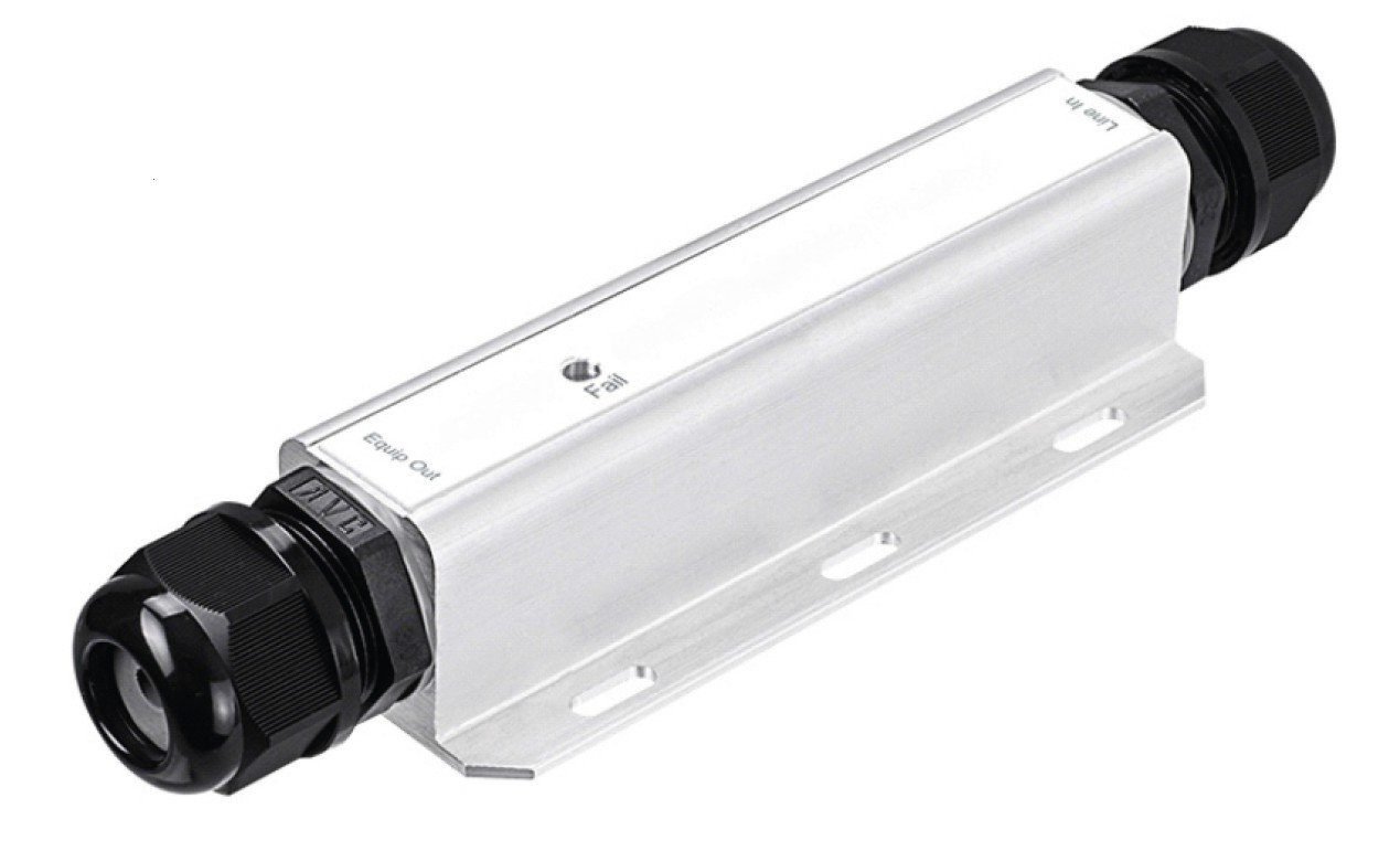 Устройство защиты питающих линий. Всепогодное устройство защиты линий Ethernet 10/100/1000T + PoE, -40~+85°C; 1 порт 10/100/1000Base-T + PoE (802.3at/3af // 60W/ 95W UPoE); крепление на столб или стену; -40 дo +85°C; IP67/IK10; гермовводы; 32х50х186 мм.