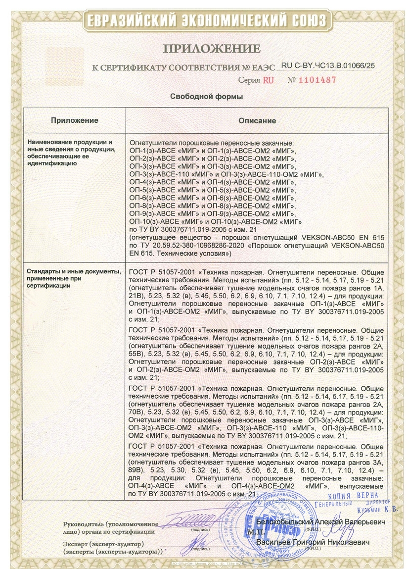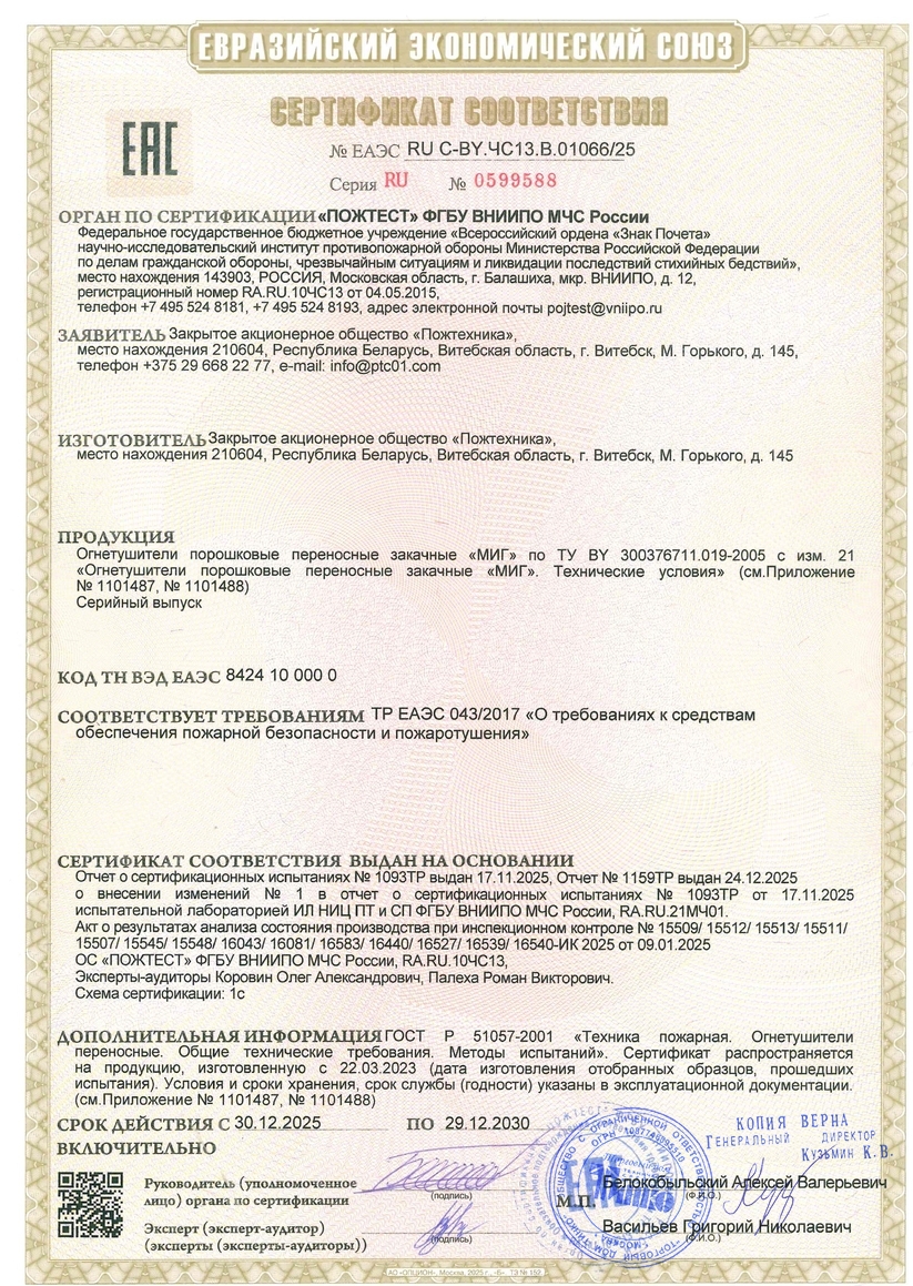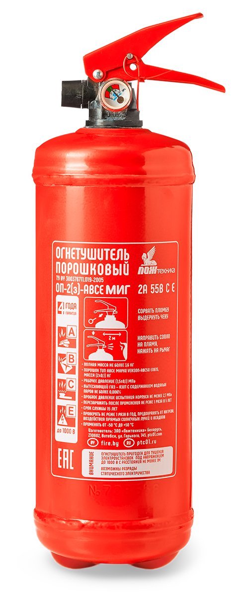 Огнетушитель порошковый закачной. Универсальный порошковый огнетушитель с повышенной огнетушащей способностью закаченный осушённым азотом; ранг огнетушителя 2А,55В,С,Е, площадь тушения 9.36 кв.м., марка порошка «Вексон-АВС 50», вес огнетушащего порошка 2 кг, объем баллона 2.5 литра, время подачи огнетушащего вещества 6 секунд; диаметр баллона 110 мм; t-раб.-50...+50°С. Вес огнетушителя: 3.6 кг.