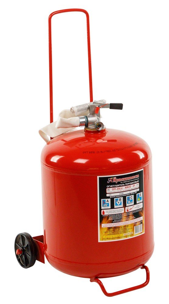 Огнетушитель порошковый закачной, передвижной. Огнетушитель порошковый, огнетушащая способность 6А, 233В; масса огнетушащего вещества 25±1.25 кг, продолжительность подачи ОТВ 20 сек, t-раб.-50…+50°C, габ.размеры D380х700 мм, масса 30 кг