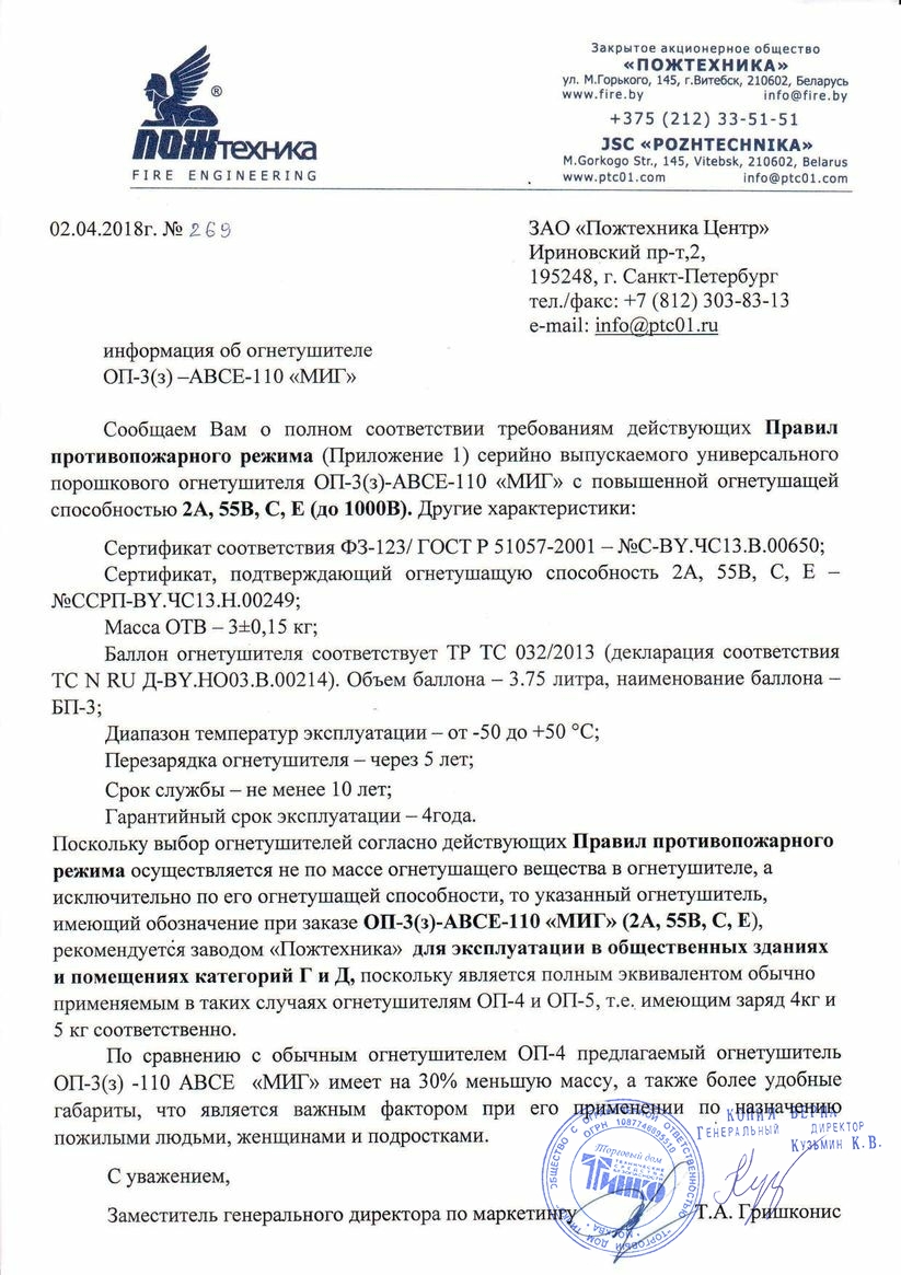 Порошковые огнетушители МИГ заряжены высококачественным огнетушащим порошком «Вексон АВС-25».