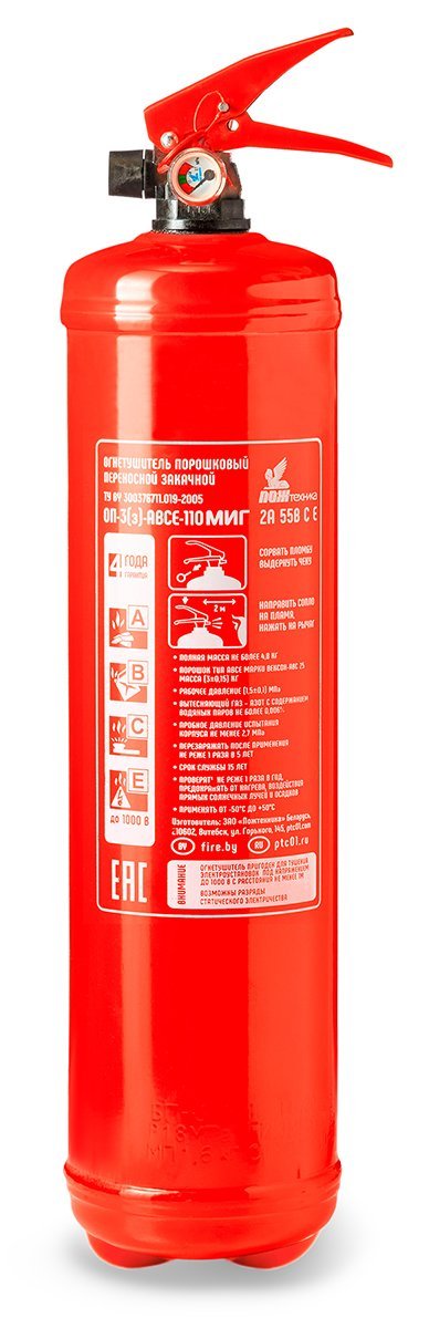 Огнетушитель порошковый закачной повышенной огнетушащей способности. Универсальный порошковый огнетушитель с повышенной огнетушащей способностью закаченный осушённым азотом; ранг огнетушителя 2А,55В,С,Е, площадь тушения 9.36 кв.м., марка порошка «Вексон-АВС 25», вес огнетушащего порошка 3 кг, объем баллона 3.8 литра, время подачи огнетушащего вещества 8 секунд; диаметр баллона 110 мм; t-раб.-50...+50°С. Вес огнетушителя: 4.8 кг.